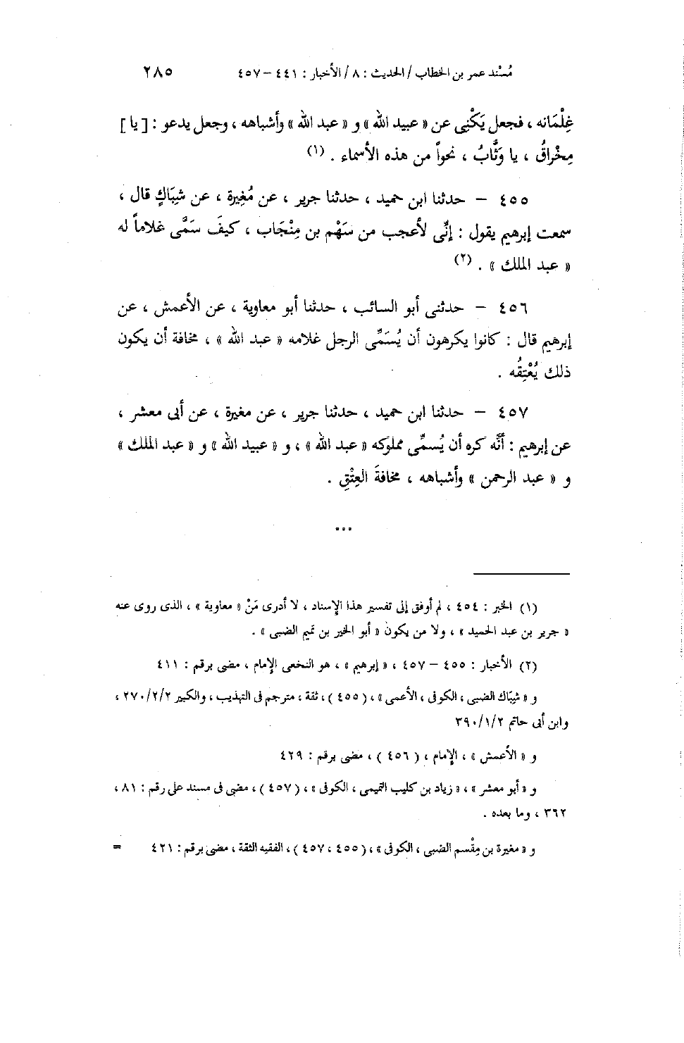 457 - حَدَّثَنَا ابْنُ حُمَيْدٍ، حَدَّثَنَا جَرِيرٌ، عَنْ مُغِيرَةَ، عَنْ أَبِي مَعْشَرٍ، عَنْ إِبْرَاهِيمَ: «أَنَّهُ §كَرِهَ أَنْ يُسَمِّيَ مَمْلُوكَهُ عَبْدَ اللَّهِ، وَعُبَيْدَ اللَّهِ، وَعَبْدَ الْمَلِكِ، وَعَبْدَ الرَّحْمَنِ، وَأَشْبَاهَهُ؛ مَخَافَةَ الْعِتْقِ» -[286]- فَهَذَا الَّذِي ذَكَرْنَا عَنِ ابْنِ عَبَّاسٍ، وَمَنْ ذَكَرْنَا عَنْهُ كَرَاهَةَ تَسْمِيَةِ عَبْدِ اللَّهِ وَعَبْدِ الرَّحْمَنِ نَظِيرُ الَّذِي رُوِيَ عَنْ سَمُرَةَ، عَنِ النَّبِيِّ صَلَّى اللهُ عَلَيْهِ وَسَلَّمَ أَنَّهُ كَرِهَ مِنْ تَسْمِيَةِ الرَّجُلِ مَمْلُوكَهُ بِرَبَاحٍ، وَنَافِعٍ، وَأَفْلَحَ؛ لِأَنَّ كَرَاهِيَتَهُ صَلَّى اللهُ عَلَيْهِ وَسَلَّمَ ذَلِكَ كَانَتْ حِذَارًا مِنْ أَنْ يُقَالَ: هَاهُنَا نَافِعٌ؟ فَيُقَالُ: لَا، أَوْ: هَاهُنَا أَفْلَحُ، أَوْ بَرَكَةٌ؟ فَيُجَابُ بِلَا. وَمَعْلُومٌ أَنَّ السَّائِلَ عَنْ إنْسَانٍ اسْمُهُ أَفْلَحُ، أَوْ نَافِعٌ، أَوْ رَبَاحٌ هَلْ هُوَ فِي مَكَانِ كَذَا؟ إِنَّمَا مَسْأَلَتُهُ تِلْكَ مَسْأَلَةٌ عَنْ شَخْصٍ مِنْ أَشْخَاصِ بَنِي آدَمَ، سُمِّيَ بِاسْمٍ جُعِلَ عَلَيْهِ دَلِيلًا يُعْرَفُ بِهِ إِذَا ذُكِرَ؛ إِذْ كَانَتِ الْأَسْمَاءُ الْعَوَارِيُّ الْمُفَرِّقَةُ بَيْنَ الْأَشْخَاصِ الْمُتَشَابِهَةِ إِنَّمَا هِيَ أَدِلَّةٌ عَلَى الْمُسَمَّى بِهَا، لَا مَسْأَلَةٌ عَنْ شَخْصٍ صِفَتُهُ النَّفْعُ وَالْفَلَاحُ وَالْبَرَكَةُ. وَذَلِكَ مِنْ كَرَاهَتِهِ صَلَّى اللهُ عَلَيْهِ وَسَلَّمَ ذَلِكَ، نَظِيرُ كَرَاهَتِهِ تَسْمِيَةَ امْرَأَةٍ كَانَتْ تُسَمَّى بَرَّةَ بِبَرَّةَ، حَتَّى حَوَّلَ اسْمَهَا عَنْ ذَلِكَ فَسَمَّاهَا جُوَيْرِيَةَ، وَكَتَحْوِيلِهِ اسْمَ أُخْرَى مِنْ عَاصِيَةَ إِلَى جَمِيلَةَ، وَكَتَغْيِيرِهِ اسْمَ أَرْضٍ طَابَتْ تُدْعَى عَفِرَةَ خَضِرَةَ، وَنَحْوِ ذَلِكَ مِمَّا يَكْثُرُ عَدَدُهُ، سَنَذْكُرُ جَمِيعَهُ إِنْ شَاءَ اللَّهُ فِي مَوْضِعِهِ -[287]-. وَمَعْلُومٌ أَنَّ تَحْوِيلَهُ صَلَّى اللهُ عَلَيْهِ وَسَلَّمَ مَا حَوَّلَ مِنْ هَذِهِ الْأَسْمَاءِ عَمَّا كَانَتْ عَلَيْهِ، لَمْ يَكُنْ لِأَنَّ التَّسْمِيَةَ بِمَا كَانَ الْمُسَمَّى بِهِ مِنْهَا مُسَمًّى قَبْلَ تَحْوِيلِهِ ذَلِكَ كَانَ حَرَامًا التَّسْمِيَةُ بِهِ؛ وَلَكِنَّ ذَلِكَ كَانَ مِنْهُ صَلَّى اللهُ عَلَيْهِ وَسَلَّمَ عَلَى وَجْهِ الِاسْتِحْبَابِ، وَاخْتِيَارِ الْأَحْسَنِ عَلَى الَّذِي هُوَ دُونَهُ فِي الْحُسْنِ، إِذْ كَانَ لَا شَيْءَ فِي الْقَبِيحِ مِنَ الْأَسْمَاءِ إِلَّا وَفِي الْجَمِيلِ الْحَسَنِ مِنْهَا مِثْلُهُ مِنَ الدِّلَالَةِ عَلَى الْمُسَمَّى بِهِ، مَعَ بَيْنُونَةِ الْأَحْسَنِ بِفَضْلِ الْحُسْنِ وَالْجَمَالِ، مِنْ غَيْرِ مَؤُونَةٍ تَلْزَمُ صَاحِبَهُ بِسَبَبِ التَّسَمِّي بِهِ. وَكَذَلِكَ كَرَاهَةُ مَنْ كَرِهَ تَسْمِيَةَ مَمْلُوكِهِ عَبْدَ اللَّهِ، وَعَبْدَ الرَّحْمَنِ، إِنَّمَا كَانَتْ كَرَاهَتُهُ ذَلِكَ؛ حِذَارًا أَنْ يُوجِبَ ذَلِكَ لَهُ الْعِتْقَ بِانْفِرَادِهِ بِهَذَا الِاسْمِ، وَلَا شَكَّ أَنَّ جَمِيعَ بَنِي آدَمَ لِلَّهِ عَبِيدٌ أَحْرَارُهُمْ وَعَبِيدُهُمْ، وَصَفَهُمْ بِذَلِكَ وَاصِفٌ أَوْ لَمْ يَصِفْهُمْ، وَلَكِنَّ كَارِهِي التَّسْمِيَةِ بِذَلِكَ صَرَفُوا هَذِهِ الْأَسْمَاءَ عَنْ رَقِيقِهِمْ؛ لِئَلَّا يَقَعَ اللَّبْسُ عَلَى السَّامِعِ لِذَلِكَ مِنْ أَسْمَائِهِمْ؛ فَيَظُنَّ أَنَّهُمْ أَحْرَارٌ؛ إِذْ كَانَ اسْتِعْمَالُ أَكْثَرِ النَّاسِ التَّسْمِيَةَ بِهَذِهِ الْأَسْمَاءِ فِي الْأَحْرَارِ، فَتَجَنَّبُوا إِلَى مَا يُزِيلُ اللَّبْسَ عَنْهُمْ مِنْ أَسْمَاءِ الْمَمَالِيكِ. وَإِذَا كَانَ الْأَمْرُ فِي ذَلِكَ عَلَى مَا وَصَفْنَا، وَالَّذِي بِهِ اسْتَشْهَدْنَا، فَالِاخْتِيَارُ ل