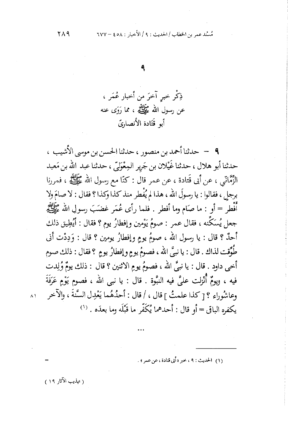 حَدَّثَنَا أَحْمَدُ بْنُ مَنْصُورٍ، حَدَّثَنَا الْحَسَنُ بْنُ مُوسَى الْأَشْيَبُ، حَدَّثَنَا أَبُو هِلَالٍ، حَدَّثَنَا غَيْلَانُ بْنُ جَرِيرٍ الْمِعْوَلِيُّ، حَدَّثَنَا عَبْدُ اللَّهِ بْنُ مَعْبَدٍ الزِّمَّانِيُّ، عَنْ أَبِي قَتَادَةَ، عَنْ عُمَرَ، قَالَ: كُنَّا مَعَ رَسُولِ اللَّهِ صَلَّى اللهُ عَلَيْهِ وَسَلَّمَ، فَمَرَرْنَا بِرَجُلٍ، فَقَالُوا: يَا رَسُولَ اللَّهِ، هَذَا لَمْ يُفْطِرْ مُنْذُ كَذَا وَكَذَا؟ فَقَالَ: «§لَا صَامَ وَلَا أَفْطَرَ» أَوْ «مَا صَامَ وَمَا أَفْطَرَ» . فَلَمَّا رَأَى عُمَرُ غَضَبَ رَسُولِ اللَّهِ صَلَّى اللهُ عَلَيْهِ وَسَلَّمَ جَعَلَ يُسَكِّنُهُ، فَقَالَ عُمَرُ: صَوْمُ يَوْمَيْنِ وَإِفْطَارُ يَوْمٍ؟ فَقَالَ: «أَيُطِيقُ ذَلِكَ أَحَدٌ» ؟ قَالَ: يَا رَسُولَ اللَّهِ، صَوْمُ يَوْمٍ وَإِفْطَارُ يَوْمَيْنِ؟ قَالَ: «وَدِدْتُ أَنِّي طُوِّقْتُ لِذَاكَ» . قَالَ: يَا نَبِيَّ اللَّهِ، فَصَوْمُ يَوْمٍ وَإِفْطَارُ يَوْمٍ؟ فَقَالَ: «ذَلِكَ صَوْمُ أَخِي دَاوُدَ» . قَالَ: يَا نَبِيَّ اللَّهِ، فَصَوْمُ يَوْمِ الِاثْنَيْنِ؟ قَالَ: «ذَلِكَ يَوْمٌ وُلِدْتُ فِيهِ، وَيَوْمٌ أُنْزِلَتْ عَلَيَّ فِيهِ النُّبُوَّةُ» . قَالَ: يَا نَبِيَّ اللَّهِ، فَصَوْمُ يَوْمِ عَرَفَةَ وَعَاشُورَاءَ؟ كَذَا عَلِمْتُ قَالَ. قَالَ: «أَحَدُهُمَا يَعْدِلُ السَّنَةَ، وَالْآخَرُ يُكَفِّرُهُ الْبَاقِي» ، أَوْ قَالَ: «أَحَدُهُمَا يُكَفِّرُ مَا قَبْلَهُ وَمَا بَعْدَهُ»