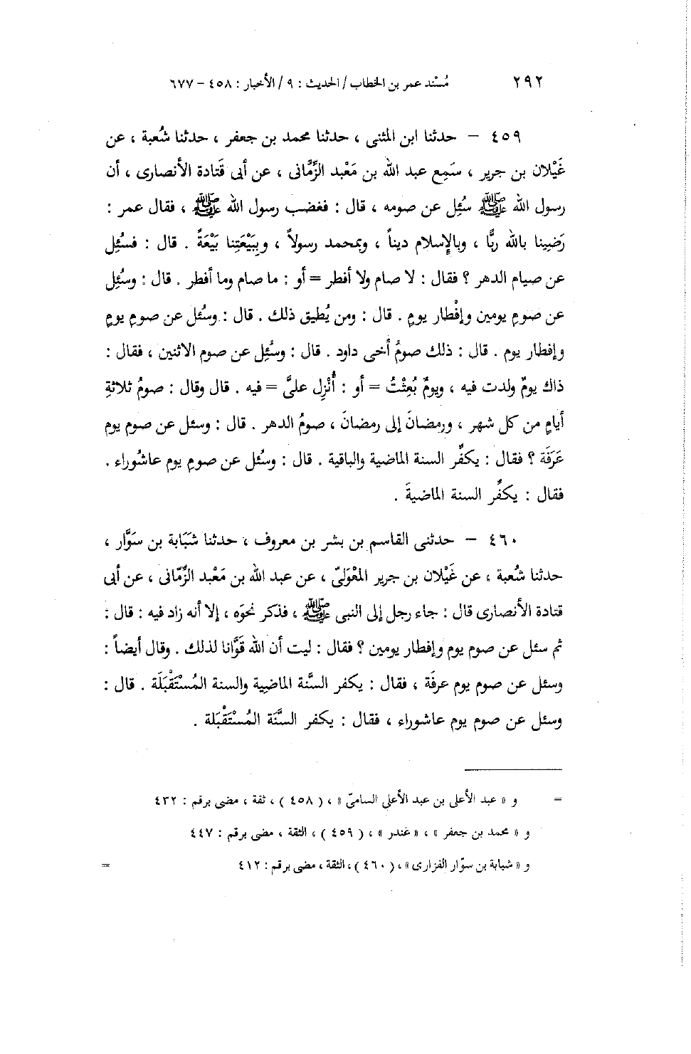 459 - حَدَّثَنَا ابْنُ الْمُثَنَّى، حَدَّثَنَا مُحَمَّدُ بْنُ جَعْفَرٍ، حَدَّثَنَا شُعْبَةُ، عَنْ غَيْلَانَ بْنِ جَرِيرٍ، سَمِعَ عَبْدَ اللَّهِ بْنَ مَعْبَدٍ الزِّمَّانِيَّ، عَنْ أَبِي قَتَادَةَ الْأَنْصَارِيِّ، أَنَّ رَسُولَ اللَّهِ صَلَّى اللهُ عَلَيْهِ وَسَلَّمَ سُئِلَ عَنْ صَوْمِهِ قَالَ: فَغَضِبَ رَسُولُ اللَّهِ صَلَّى اللهُ عَلَيْهِ وَسَلَّمَ، فَقَالَ عُمَرُ: رَضِينَا بِاللَّهِ رَبًّا، وَبِالْإِسْلَامِ دِينًا، وَبِمُحَمَّدٍ رَسُولًا، وَبِبَيْعَتِنَا بَيْعَةً. قَالَ: فَسُئِلَ عَنْ صِيَامِ الدَّهْرِ؟ فَقَالَ: «§لَا صَامَ وَلَا أَفْطَرَ» أَوْ: «مَا صَامَ وَمَا أَفْطَرَ» . قَالَ: وَسُئِلَ عَنْ صَوْمِ يَوْمَيْنِ وَإِفْطَارِ يَوْمٍ، قَالَ: «وَمَنْ يُطِيقُ ذَلِكَ» . قَالَ: وَسُئِلَ عَنْ صَوْمِ يَوْمٍ وَإِفْطَارِ يَوْمٍ. قَالَ: «ذَلِكَ صَوْمُ أَخِي دَاوُدُ» . قَالَ: وَسُئِلَ عَنْ صَوْمِ الِاثْنَيْنِ، فَقَالَ: «ذَاكَ يَوْمٌ وُلِدْتُ فِيهِ، وَيَوْمٌ بُعِثْتُ - أَوْ أُنْزِلَ عَلَيَّ - فِيهِ» . قَالَ: وَقَالَ: «صَوْمُ ثَلَاثَةِ أَيَّامٍ مِنْ كُلِّ شَهْرٍ، وَرَمَضَانَ إِلَى رَمَضَانَ، صَوْمُ الدَّهْرِ» . قَالَ: وَسُئِلَ عَنْ صَوْمِ يَوْمِ عَرَفَةَ؟ فَقَالَ: «يُكَفِّرُ السَّنَةَ الْمَاضِيَةَ وَالْبَاقِيَةَ» . قَالَ: وَسُئِلَ عَنْ صَوْمِ يَوْمِ عَاشُورَاءَ، فَقَالَ: «يُكَفِّرُ السَّنَةَ الْمَاضِيَةَ» ،
