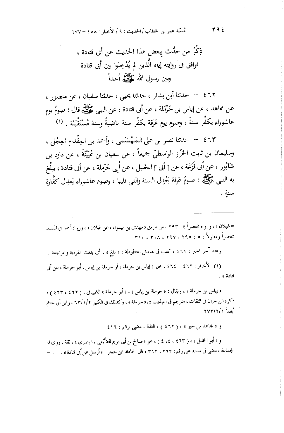 462 - حَدَّثَنَا ابْنُ بَشَّارٍ، حَدَّثَنَا يَحْيَى، حَدَّثَنَا سُفْيَانُ، عَنْ مَنْصُورٍ، عَنْ مُجَاهِدٍ، عَنْ إِيَاسَ بْنِ حَرْمَلَةَ، عَنْ أَبِي قَتَادَةَ عَنِ النَّبِيِّ صَلَّى اللهُ عَلَيْهِ وَسَلَّمَ قَالَ: «§صَوْمُ يَوْمِ عَاشُورَاءَ يُكَفِّرُ سَنَةً، وَصَوْمُ يَوْمِ عَرَفَةَ يُكَفِّرُ سَنَةً مَاضِيَةً، وَسَنَةً مُسْتَقْبَلَةً»