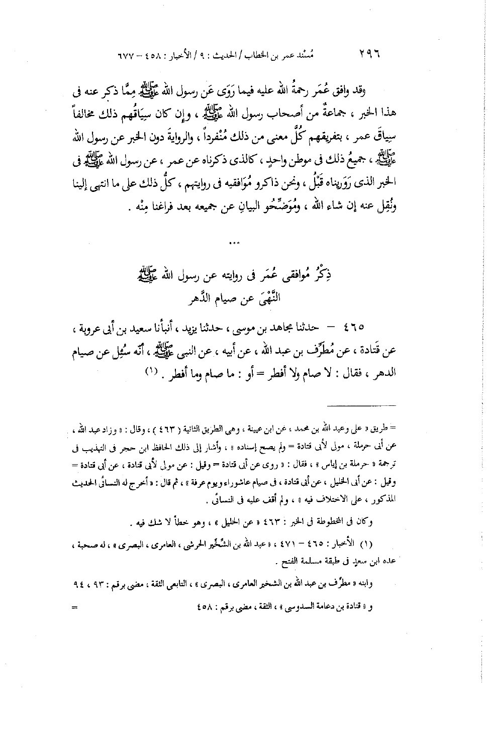 465 - حَدَّثَنَا مُجَاهِدُ بْنُ مُوسَى، حَدَّثَنَا يَزِيدُ، أَنْبَأَنَا سَعِيدُ بْنُ أَبِي عَرُوبَةَ، عَنْ قَتَادَةَ، عَنْ مُطَرِّفِ بْنِ عَبْدِ اللَّهِ، عَنْ أَبِيهِ عَنِ النَّبِيِّ صَلَّى اللهُ عَلَيْهِ وَسَلَّمَ أَنَّهُ سُئِلَ عَنْ صِيَامِ الدَّهْرِ، فَقَالَ: «§لَا صَامَ وَلَا أَفْطَرَ» ، أَوْ: «مَا صَامَ وَمَا أَفْطَرَ»