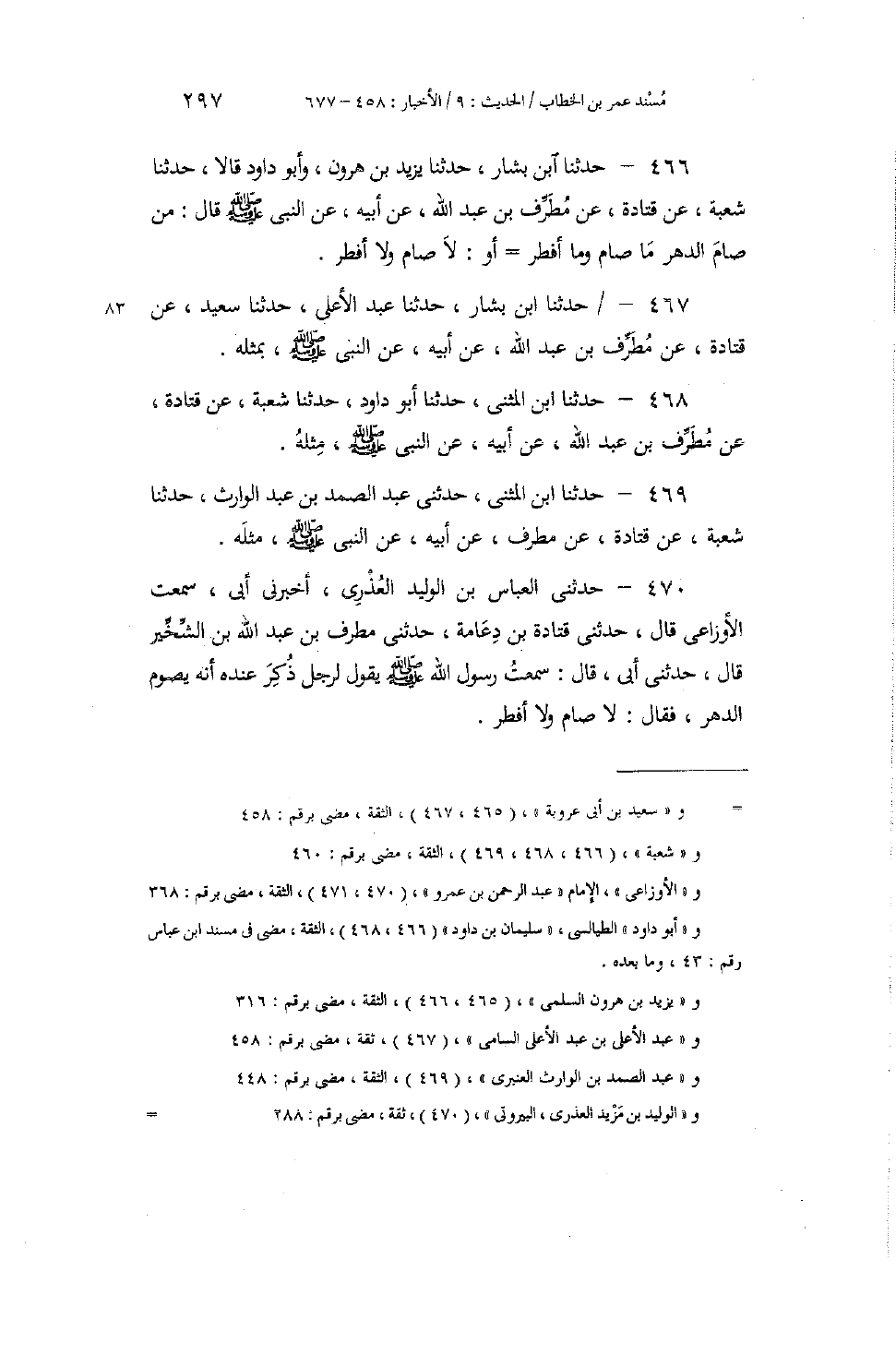 466 - حَدَّثَنَا ابْنُ بَشَّارٍ، حَدَّثَنَا يَزِيدُ بْنُ هَارُونَ، وَأَبُو دَاوُدَ، قَالَا: حَدَّثَنَا شُعْبَةُ، عَنْ قَتَادَةَ، عَنْ مُطَرِّفِ بْنِ عَبْدِ اللَّهِ، عَنْ أَبِيهِ عَنِ النَّبِيِّ صَلَّى اللهُ عَلَيْهِ وَسَلَّمَ قَالَ: «§مَنْ صَامَ الدَّهْرَ مَا صَامَ وَمَا أَفْطَرَ» ، أَوْ: «لَا صَامَ وَلَا أَفْطَرَ» ،