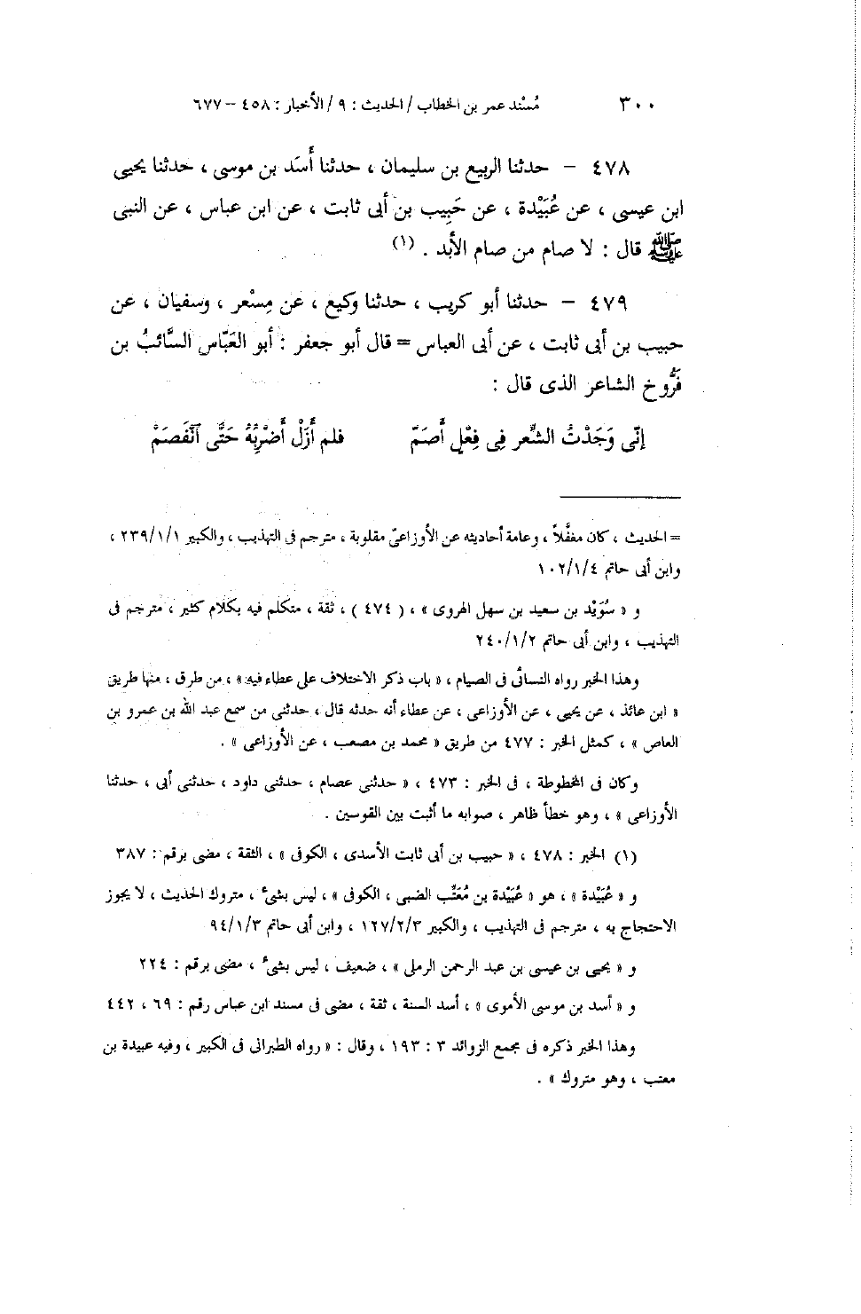 478 - حَدَّثَنَا الرَّبِيعُ بْنُ سُلَيْمَانَ، حَدَّثَنَا أَسَدُ بْنُ مُوسَى، حَدَّثَنَا يَحْيَى بْنُ عِيسَى، عَنْ عُبَيْدَةَ، عَنْ حَبِيبِ بْنِ أَبِي ثَابِتٍ، عَنِ ابْنِ عَبَّاسٍ عَنِ النَّبِيِّ صَلَّى اللهُ عَلَيْهِ وَسَلَّمَ قَالَ: «§لَا صَامَ مَنْ صَامَ الْأَبَدَ»