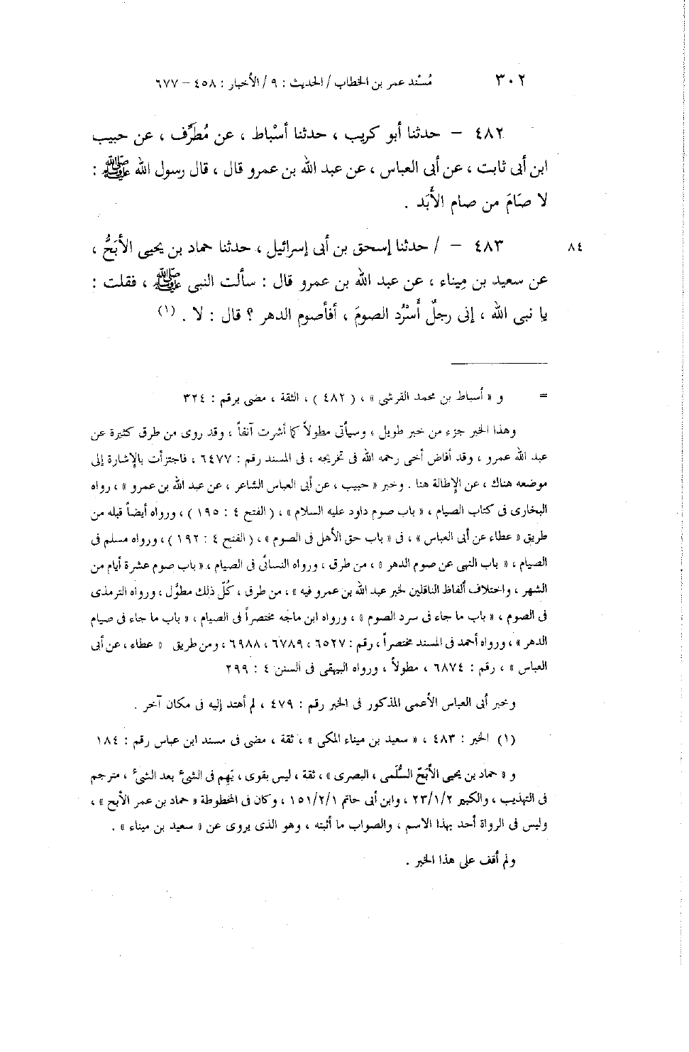 482 - حَدَّثَنَا أَبُو كُرَيْبٍ، حَدَّثَنَا أَسْبَاطٌ، عَنْ مُطَرِّفٍ، عَنْ حَبِيبِ بْنِ أَبِي ثَابِتٍ، عَنْ أَبِي الْعَبَّاسِ، عَنْ عَبْدِ اللَّهِ بْنِ عَمْرٍو، قَالَ: قَالَ رَسُولُ اللَّهِ صَلَّى اللهُ عَلَيْهِ وَسَلَّمَ: «§لَا صَامَ مَنْ صَامَ الْأَبَدَ»