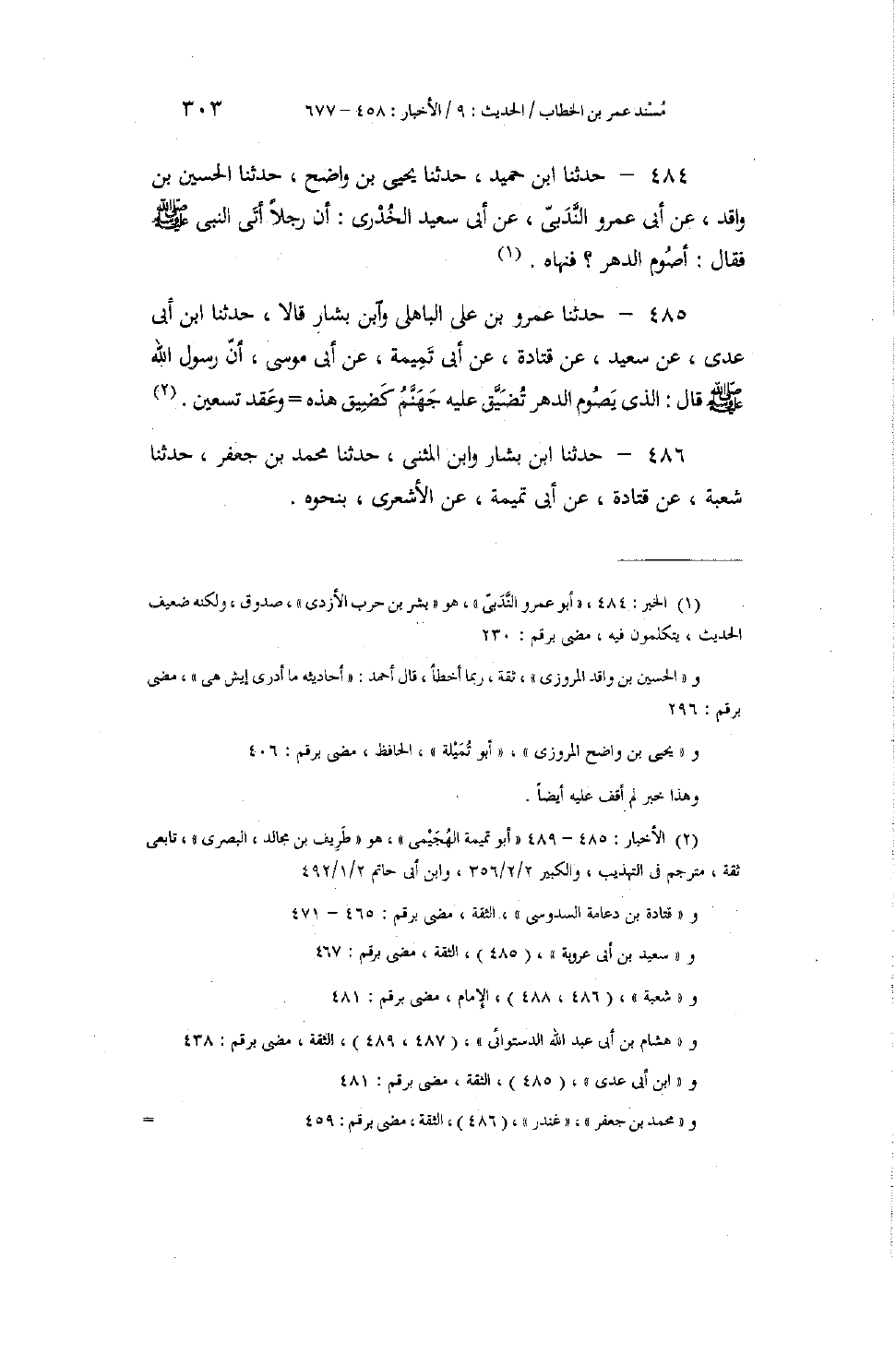 484 - حَدَّثَنَا ابْنُ حُمَيْدٍ، حَدَّثَنَا يَحْيَى بْنُ وَاضِحٍ، حَدَّثَنَا الْحُسَيْنُ بْنُ وَاقِدٍ، عَنْ أَبِي عَمْرٍو النَّدَبِيِّ، عَنْ أَبِي سَعِيدٍ الْخُدْرِيِّ: " أَنَّ رَجُلًا أَتَى النَّبِيَّ صَلَّى اللهُ عَلَيْهِ وَسَلَّمَ فَقَالَ: §أَصُومُ الدَّهْرَ؟ فَنَهَاهُ "