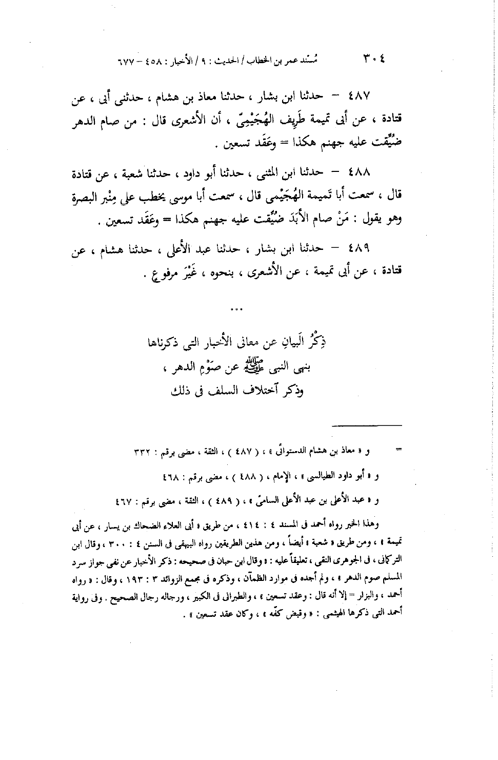 487 - حَدَّثَنَا ابْنُ بَشَّارٍ، حَدَّثَنَا مُعَاذُ بْنُ هِشَامٍ، حَدَّثَنِي أَبِي، عَنْ قَتَادَةَ، عَنْ أَبِي تَمِيمَةَ طَرِيفٍ الْهُجَيْمِيِّ أَنَّ الْأَشْعَرِيَّ، قَالَ: «§مَنْ صَامَ الدَّهْرَ ضُيِّقَتْ عَلَيْهِ جَهَنَّمُ هَكَذَا» وَعَقَدَ تِسْعِينَ