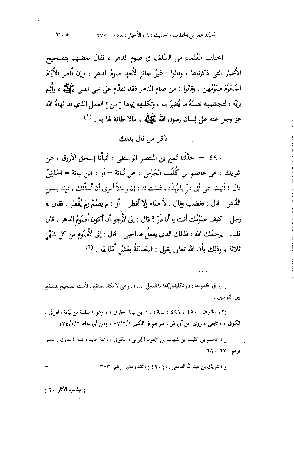 490 - حَدَّثَنَا تَمِيمُ بْنُ الْمُنْتَصِرِ الْوَاسِطِيُّ، أَنْبَأَنَا إِسْحَاقُ الْأَزْرَقُ، عَنْ شَرِيكٍ، عَنْ عَاصِمِ بْنِ كُلَيْبٍ الْجَرْمِيِّ، عَنْ نُبَاتَةَ أَوِ ابْنِ نُبَاتَةَ الْحَارِثِيِّ، قَالَ: أَتَيْتُ عَلَى أَبِي ذَرٍّ بِالرَّبَذَةِ، فَقُلْتُ لَهُ: إِنَّ رَجُلًا أَمَرَنِي أَنْ أَسْأَلَكَ، فَإِنَّهُ يَصُومُ الدَّهْرَ. قَالَ: فَغَضِبَ وَقَالَ: " لَا صَامَ وَلَا أَفْطَرَ - أَوْ: لَمْ يَصُمْ وَلَمْ يُفْطِرْ "، فَقَالَ لَهُ رَجُلٌ: كَيْفَ صَوْمُكَ أَنْتَ يَا أَبَا ذَرٍّ؟ قَالَ: «إِنِّي لَأَرْجُو أَنْ أَكُونَ أَصُومُ الدَّهْرَ» ، قَالَ: قُلْتُ: يَرْحَمُكَ اللَّهُ، فَذَلِكَ الَّذِي يَفْعَلُ صَاحِبِي. قَالَ: " §إِنِّي لَأَصُومُ مِنْ كُلِّ شَهْرٍ ثَلَاثَةً؛ وَذَلِكَ بِأَنَّ اللَّهَ تَعَالَى يَقُولُ: الْحَسَنَةُ بِعَشْرِ أَمْثَالِهَا "