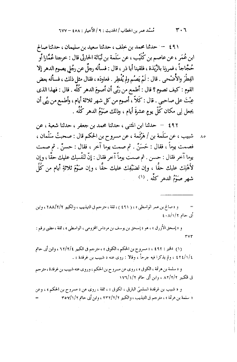 491 - حَدَّثَنَا مُحَمَّدُ بْنُ خَلَفٍ، حَدَّثَنَا سَعِيدُ بْنُ سُلَيْمَانَ، حَدَّثَنَا صَالِحُ بْنُ عُمَرَ، عَنْ عَاصِمِ بْنِ كُلَيْبٍ، عَنْ سَلَمَةَ بْنِ نُبَاتَةَ الْحَارِثِيِّ، قَالَ: خَرَجْنَا عُمَّارًا أَوْ حُجَّاجًا، فَمَرَرْنَا بِالرَّبَذَةِ، فَلَقِينَا أَبَا ذَرٍّ، قَالَ: فَسَأَلَهُ رَجُلٌ عَنْ رَجُلٍ يَصُومُ الدَّهْرَ إِلَّا الْفِطْرَ وَالْأَضْحَى. قَالَ: «لَمْ يَصُمْ وَلَمْ يُفْطِرْ» فَعَاوَدَهُ، فَقَالَ مِثْلَ ذَلِكَ، فَسَأَلَهُ بَعْضُ الْقَوْمِ: كَيْفَ تَصُومُ؟ قَالَ: «§أَطْمَعُ مِنْ رَبِّي أَنْ أَصُومَ الدَّهْرَ كُلَّهُ» ، قَالَ: فَهَذَا الَّذِي عِبْتَ عَلَى صَاحِبِي. قَالَ: «كَلَّا، أَصُومُ مِنْ كُلِّ شَهْرٍ ثَلَاثَةَ أَيَّامٍ، وَأَطْمَعُ مِنْ رَبِّي أَنْ يَجْعَلَ لِي مَكَانَ كُلِّ يَوْمٍ عَشَرَةَ أَيَّامٍ، وَذَلِكَ صَوْمُ الدَّهْرِ كُلِّهِ»