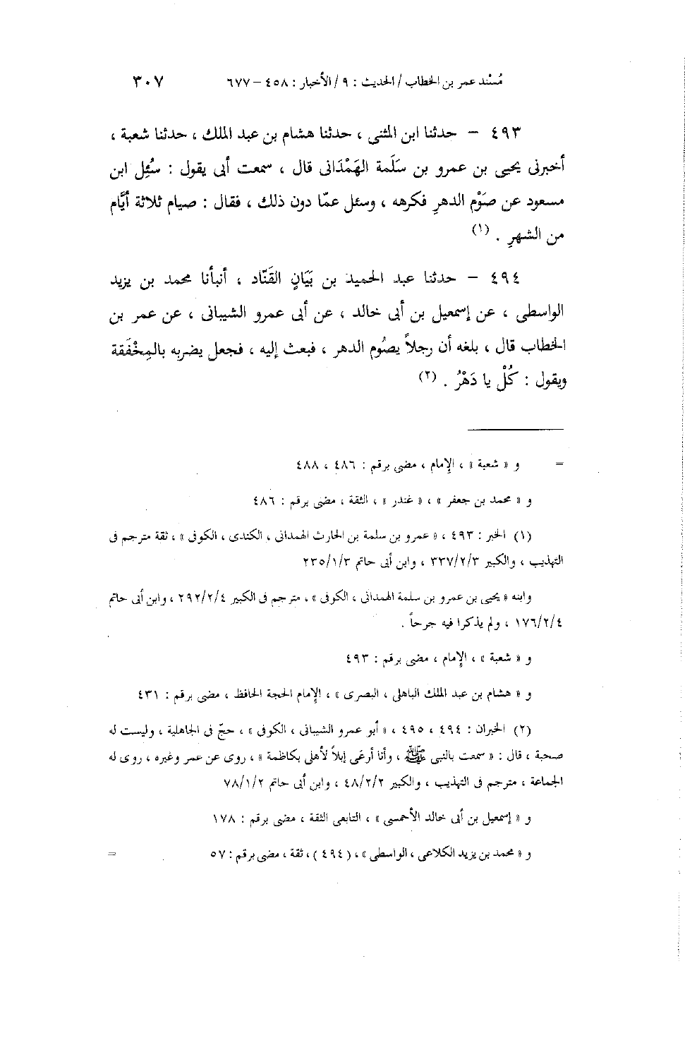494 - حَدَّثَنَا عَبْدُ الْحَمِيدِ بْنُ بَيَانٍ الْقَنَّادُ، أَنْبَأَنَا مُحَمَّدُ بْنُ يَزِيدَ الْوَاسِطِيُّ، عَنْ إِسْمَاعِيلَ بْنِ أَبِي خَالِدٍ، عَنْ أَبِي عَمْرٍو الشَّيْبَانِيِّ، عَنْ عُمَرَ بْنِ الْخَطَّابِ، قَالَ: بَلَغَهُ أَنَّ رَجُلًا يَصُومُ الدَّهْرَ، فَبَعَثَ إِلَيْهِ، فَجَعَلَ يَضْرِبُهُ بِالْمِخْفَقَةِ وَيَقُولُ: «§كُلْ يَا دَهْرُ»