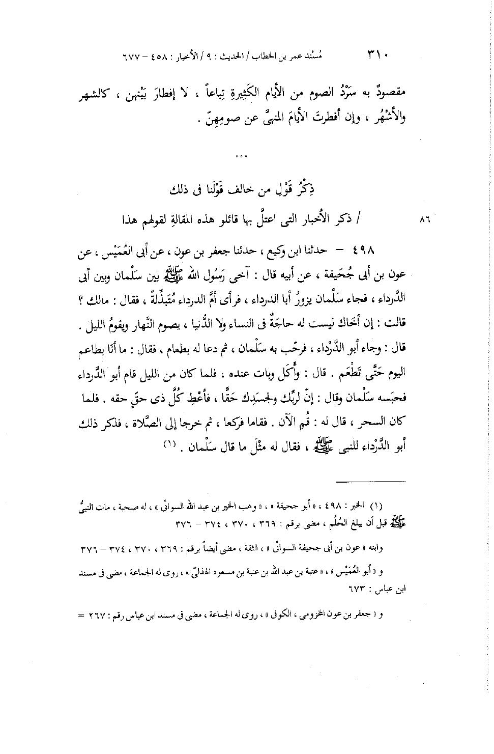 498 - حَدَّثَنَا ابْنُ وَكِيعٍ، حَدَّثَنَا جَعْفَرُ بْنُ عَوْنٍ، عَنْ أَبِي الْعُمَيْسِ، عَنْ عَوْنِ بْنِ أَبِي جُحَيْفَةَ، عَنْ أَبِيهِ، قَالَ: آخَى رَسُولُ اللَّهِ صَلَّى اللهُ عَلَيْهِ وَسَلَّمَ بَيْنَ سَلْمَانَ وَبَيْنَ أَبِي الدَّرْدَاءِ، فَجَاءَ سَلْمَانُ يَزُورُ أَبَا الدَّرْدَاءِ، فَرَأَى أُمَّ الدَّرْدَاءِ مُتَبَذِّلَةً، فَقَالَ: مَا لَكِ؟ قَالَتْ: إِنَّ أَخَاكَ لَيْسَتْ لَهُ حَاجَةٌ فِي النِّسَاءِ وَلَا الدُّنْيَا، يَصُومُ النَّهَارَ وَيَقُومُ اللَّيْلَ. قَالَ: وَجَاءَ أَبُو الدَّرْدَاءِ، فَرَحَّبَ بِهِ سَلْمَانُ، ثُمَّ دَعَا لَهُ بِطَعَامٍ، فَقَالَ: مَا أَنَا بِطَاعِمٍ الْيَوْمَ حَتَّى تَطْعَمَ. قَالَ: وَأَكَلَ وَبَاتَ عِنْدَهُ، فَلَمَّا كَانَ مِنَ اللَّيْلِ قَامَ أَبُو الدَّرْدَاءِ فَحَبَسَهُ سَلْمَانُ وَقَالَ: " إِنَّ §لِرَبِّكَ وَلِجَسَدِكَ حَقًّا، فَأَعْطِ كُلَّ ذِي حَقٍّ حَقَّهُ. فَلَمَّا كَانَ السَّحَرُ، قَالَ لَهُ: قُمِ الْآنَ. فَقَامَا فَرَكَعَا، ثُمَّ خَرَجَا إِلَى الصَّلَاةِ " فَذَكَرَ ذَلِكَ أَبُو الدَّرْدَاءِ لِلنَّبِيِّ صَلَّى اللهُ عَلَيْهِ وَسَلَّمَ، فَقَالَ لَهُ مِثْلَ مَا قَالَ سَلْمَانُ
