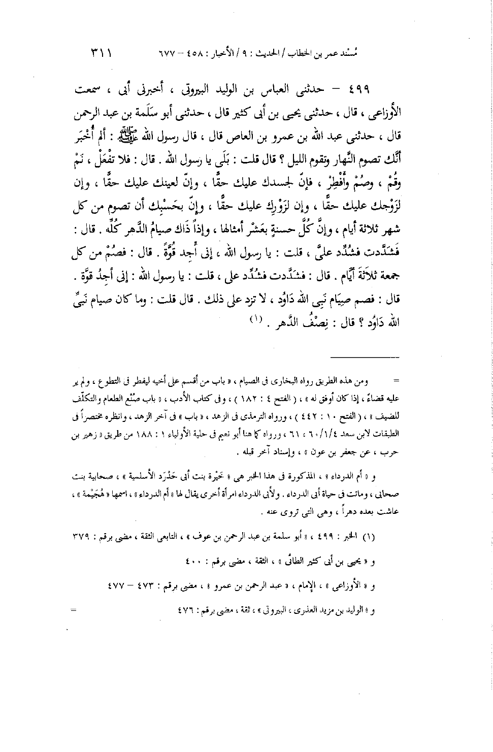 499 - حَدَّثَنِي الْعَبَّاسِ بْنُ الْوَلِيدِ الْبَيْرُوتِيُّ، أَخْبَرَنِي أَبِي، سَمِعْتُ الْأَوْزَاعِيَّ، قَالَ: حَدَّثَنِي يَحْيَى بْنُ أَبِي كَثِيرٍ، قَالَ: حَدَّثَنِي أَبُو سَلَمَةَ بْنُ عَبْدِ الرَّحْمَنِ، قَالَ: حَدَّثَنِي عَبْدُ اللَّهِ بْنُ عَمْرِو بْنِ الْعَاصِ، قَالَ: قَالَ رَسُولُ اللَّهِ صَلَّى اللهُ عَلَيْهِ وَسَلَّمَ: «§أَلَمْ أُخْبَرْ أَنَّكَ تَصُومُ النَّهَارَ وَتَقُومُ اللَّيْلَ؟» . قَالَ: قُلْتُ: بَلَى يَا رَسُولَ اللَّهِ. قَالَ: «فَلَا تَفْعَلْ، نَمْ وَقُمْ، وَصُمْ وَأَفْطِرْ، فَإِنَّ لِجَسَدِكَ عَلَيْكَ حَقًّا، وَإِنَّ لِعَيْنِكَ عَلَيْكَ حَقًّا، وَإِنَّ لِزَوْجِكَ عَلَيْكَ حَقًّا، وَإِنَّ لِزَوْرِكَ عَلَيْكَ حَقًّا، وَإِنَّ بِحَسْبِكَ أَنْ تَصُومَ مِنْ كُلِّ شَهْرٍ ثَلَاثَةَ أَيَّامٍ، وَإِنَّ كُلَّ حَسَنَةٍ بِعَشْرِ أَمْثَالِهَا، وَإِذًا ذَاكَ صِيَامُ الدَّهْرِ كُلِّهِ» . قَالَ: فَشَدَّدْتُ؛ فَشُدِّدَ عَلَيَّ، قُلْتُ: يَا رَسُولَ اللَّهِ، إِنِّي أَجِدُ قُوَّةً. قَالَ: «فَصُمْ مِنْ كُلِّ جُمُعَةٍ ثَلَاثَةَ أَيَّامٍ» . قَالَ: فَشَدَّدْتُ؛ فَشُدِّدَ عَلَيَّ، قُلْتُ: يَا رَسُولَ اللَّهِ: إِنِّي أَجِدُ قُوَّةً. قَالَ: «فَصُمْ صِيَامَ نَبِيِّ اللَّهِ دَاوُدَ، لَا تَزِدْ عَلَى ذَلِكَ» . قَالَ: قُلْتُ: وَمَا كَانَ صِيَامُ نَبِيِّ اللَّهِ دَاوُدَ؟ قَالَ: «نِصْفُ الدَّهْرِ»
