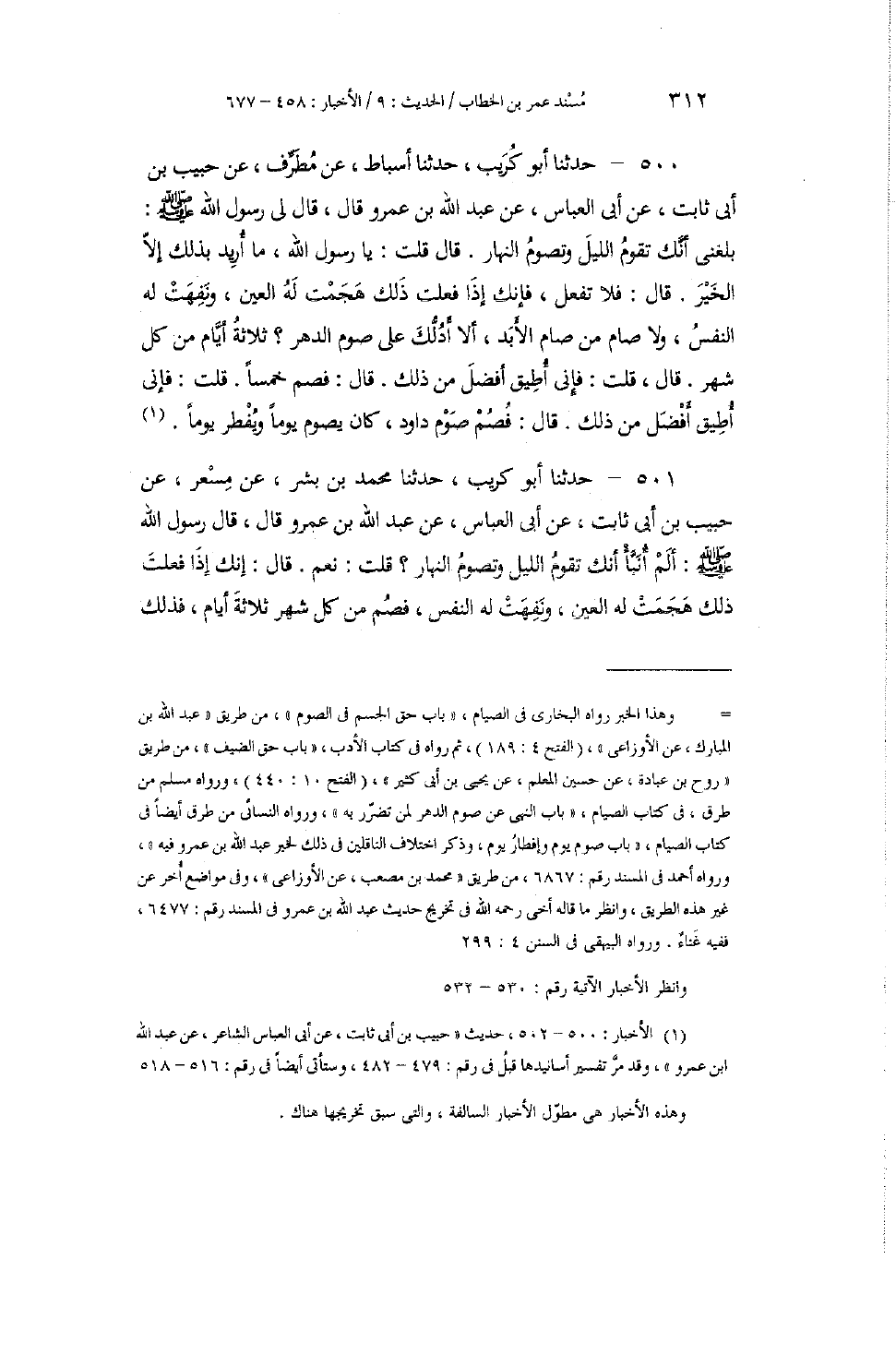 501 - حَدَّثَنَا أَبُو كُرَيْبٍ، حَدَّثَنَا مُحَمَّدُ بْنُ بِشْرٍ، عَنْ مِسْعَرٍ، عَنْ حَبِيبِ بْنِ أَبِي ثَابِتٍ، عَنْ أَبِي الْعَبَّاسِ، عَنْ عَبْدِ اللَّهِ بْنِ عَمْرٍو، قَالَ: قَالَ رَسُولُ اللَّهِ صَلَّى اللهُ عَلَيْهِ وَسَلَّمَ: «§أَلَمْ أُنَبَّأْ أَنَّكَ تَقُومُ اللَّيْلَ وَتَصُومُ النَّهَارَ» ؟ قُلْتُ: نَعَمْ. قَالَ: «إِنَّكَ إِذَا فَعَلْتَ ذَلِكَ هَجَمَتْ لَهُ الْعَيْنُ، وَنَفِهَتْ لَهُ النَّفْسُ، فَصُمْ مِنْ كُلِّ شَهْرٍ ثَلَاثَةَ أَيَّامٍ، فَذَلِكَ -[313]- صَوْمُ الدَّهْرِ - أَوْ كَصَوْمِ الدَّهْرِ» . قُلْتُ: إِنِّي أَجِدُ بِي قُوَّةً. قَالَ: «صُمْ صَوْمَ دَاوُدَ، كَانَ يَصُومُ يَوْمًا وَيُفْطِرُ يَوْمًا، وَلَا يَفِرُّ إِذَا لَاقَى»