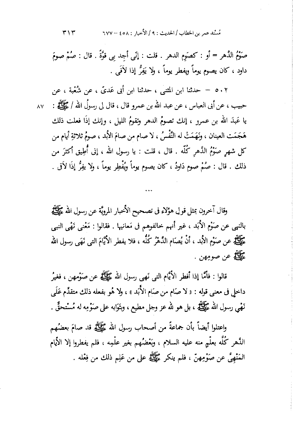 502 - حَدَّثَنَا ابْنُ الْمُثَنَّى، حَدَّثَنَا ابْنُ أَبِي عَدِيٍّ، عَنْ شُعْبَةَ، عَنْ حَبِيبٍ، عَنْ أَبِي الْعَبَّاسِ، عَنْ عَبْدِ اللَّهِ بْنِ عَمْرٍو، قَالَ: قَالَ لِي رَسُولُ اللَّهِ صَلَّى اللهُ عَلَيْهِ وَسَلَّمَ: «يَا عَبْدَ اللَّهِ بْنَ عَمْرٍو §إِنَّكَ تَصُومُ الدَّهْرَ وَتَقُومُ اللَّيْلَ، وَإِنَّكَ إِذَا فَعَلْتَ ذَلِكَ هَجَمَتِ الْعَيْنَانِ، وَنَهَمَتْ لَهُ النَّفْسُ، لَا صَامَ مَنْ صَامَ الْأَبَدَ، صَوْمُ ثَلَاثَةِ أَيَّامٍ مِنْ كُلِّ شَهْرٍ صَوْمُ الدَّهْرِ كُلِّهِ» . قَالَ: قُلْتُ: يَا رَسُولَ اللَّهِ، إِنِّي أُطِيقُ أَكْثَرَ مِنْ ذَلِكَ. قَالَ: «صُمْ صَوْمَ دَاوُدَ، كَانَ يَصُومُ يَوْمًا وَيُفْطِرُ يَوْمًا، وَلَا يَفِرُّ إِذَا لَاقَى» وَقَالَ آخَرُونَ بِمِثْلِ قَوْلِ هَؤُلَاءِ فِي تَصْحِيحِ الْأَخْبَارِ الْمَرْوِيَّةِ عَنْ رَسُولِ اللَّهِ صَلَّى اللهُ عَلَيْهِ وَسَلَّمَ بِالنَّهْيِ عَنْ صَوْمِ الْأَبَدِ، غَيْرَ أَنَّهُمْ خَالَفُوهُمْ فِي مَعَانِيهَا. فَقَالُوا: مَعْنَى نَهْيِ النَّبِيِّ صَلَّى اللهُ عَلَيْهِ وَسَلَّمَ عَنْ صَوْمِ الْأَبَدِ، أَنْ يُصَامَ الدَّهْرُ كُلُّهُ، فَلَا يُفْطِرُ الْأَيَّامَ الَّتِي نَهَى رَسُولُ اللَّهِ صَلَّى اللهُ عَلَيْهِ وَسَلَّمَ عَنْ صَوْمِهِنَّ. قَالُوا: فَأَمَّا إِذَا أَفْطَرَ الْأَيَّامَ الَّتِي نَهَى رَسُولُ اللَّهِ صَلَّى اللهُ عَلَيْهِ وَسَلَّمَ عَنْ صَوْمِهِنَّ، فَغَيْرُ دَاخِلٍ فِي مَعْنَى قَوْلِهِ: «لَا صَامَ مَنْ صَامَ الْأَبَدَ» ، وَلَا هُوَ بِفِعْلِهِ ذَلِكَ مُتَقَدِّمٌ عَلَى نَهْيِ رَسُولِ اللَّهِ صَلَّى اللهُ عَلَيْهِ وَسَلَّمَ، بَلْ هُوَ لِلَّهِ عَزَّ وَجَلَّ مُطِيعٌ، وَبِثَوَابِهِ عَلَى صَوْمِهِ لَهُ مُسْتَحِقٌّ. وَاعْتَلُّوا أَيْضًا بِأَنَّ جَمَاعَةً مِنْ أَصْحَابِ رَسُولِ اللَّهِ صَلَّى اللهُ عَلَيْهِ وَسَلَّمَ قَدْ صَامَ بَعْضُهُمُ الدَّهْرَ كُلَّهُ بِعِلْمٍ مِنْهُ عَلَيْهِ السَّلَامُ، وَبَعْضُهُمْ بِغَيْرِ عِلْمِهِ، فَلَمْ يُفْطِرُوا إِلَّا الْأَيَّامَ الْمَنْهِيَّ عَنْ صَوْمِهِنَّ، فَلَمْ يُنْكِرْ صَلَّى اللهُ عَلَيْهِ وَسَلَّمَ عَلَى مَنْ عَلِمَ ذَلِكَ مِنْ فِعْلِهِ
