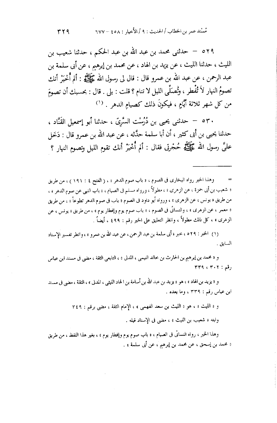 529 - حَدَّثَنِي مُحَمَّدُ بْنُ عَبْدِ اللَّهِ بْنِ عَبْدِ الْحَكَمِ، حَدَّثَنَا شُعَيْبُ بْنُ اللَّيْثِ، حَدَّثَنَا اللَّيْثُ، عَنْ يَزِيدَ بْنِ الْهَادِ، عَنْ مُحَمَّدِ بْنِ إِبْرَاهِيمَ، عَنْ أَبِي سَلَمَةَ بْنِ عَبْدِ الرَّحْمَنِ، عَنْ عَبْدِ اللَّهِ بْنِ عَمْرٍو، قَالَ: قَالَ لِي رَسُولُ اللَّهِ صَلَّى اللهُ عَلَيْهِ وَسَلَّمَ: «§أَلَمْ أُخْبَرْ أَنَّكَ تَصُومُ النَّهَارَ لَا تُفْطِرُ، وَتُصَلِّي اللَّيْلَ لَا تَنَامُ» ؟ قُلْتُ: بَلَى. قَالَ: «بِحَسْبِكَ أَنْ تَصُومَ مِنْ كُلِّ شَهْرٍ ثَلَاثَةَ أَيَّامٍ، فَيَكُونَ ذَلِكَ كَصِيَامِ الدَّهْرِ»