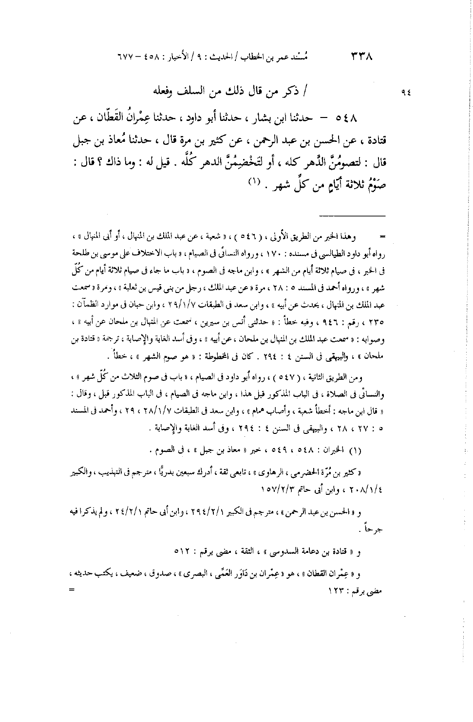 548 - حَدَّثَنَا ابْنُ بَشَّارٍ، حَدَّثَنَا أَبُو دَاوُدَ، حَدَّثَنَا عِمْرَانُ الْقَطَّانُ، عَنْ قَتَادَةَ، عَنِ الْحَسَنِ بْنِ عَبْدِ الرَّحْمَنِ، عَنْ كَثِيرِ بْنِ مُرَّةَ، قَالَ: حَدَّثَنَا مُعَاذُ بْنُ جَبَلٍ، قَالَ: " §لَتَصُومُنَّ الدَّهْرَ كُلَّهُ، أَوْ لَتَخْضِمُنَّ الدَّهْرَ كُلَّهُ. قِيلَ لَهُ: وَمَا ذَاكَ؟ قَالَ: صَوْمُ ثَلَاثَةِ أَيَّامٍ مِنْ كُلِّ شَهْرٍ "
