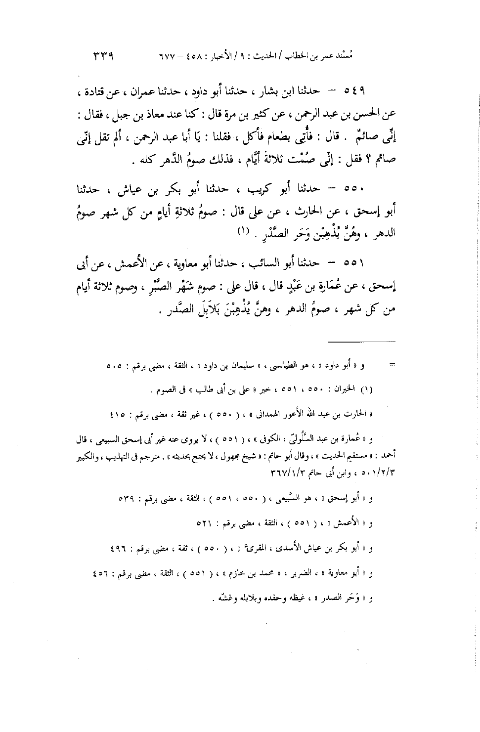 550 - حَدَّثَنَا أَبُو كُرَيْبٍ، حَدَّثَنَا أَبُو بَكْرِ بْنُ عَيَّاشٍ، حَدَّثَنَا أَبُو إِسْحَاقَ، عَنِ الْحَارِثِ، عَنْ عَلِيٍّ، قَالَ: «§صَوْمُ ثَلَاثَةِ أَيَّامٍ مِنْ كُلِّ شَهْرٍ صَوْمُ الدَّهْرِ، وَهُنَّ يُذْهِبْنَ وَحَرَ الصَّدْرِ»