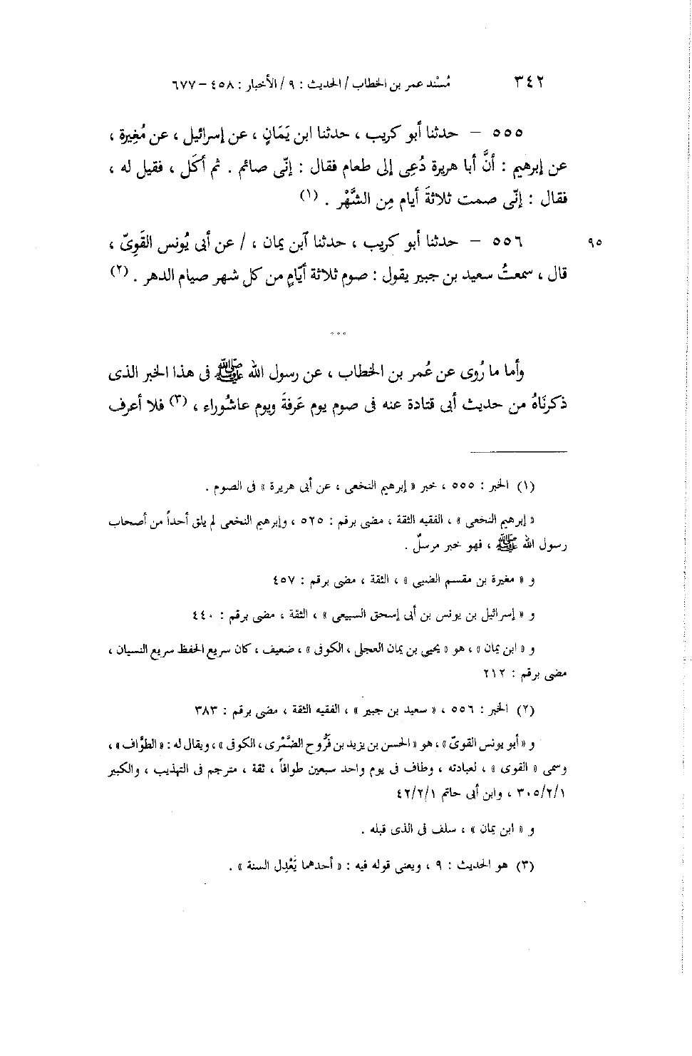 556 - حَدَّثَنَا أَبُو كُرَيْبٍ، حَدَّثَنَا ابْنُ يَمَانٍ، عَنْ أَبِي يُونُسَ الْقَوِيِّ، قَالَ: سَمِعْتُ سَعِيدَ بْنَ جُبَيْرٍ، يَقُولُ: «§صَوْمُ ثَلَاثَةِ أَيَّامٍ مِنْ كُلِّ شَهْرٍ صِيَامُ الدَّهْرِ» وَأَمَّا مَا رُوِيَ عَنْ عُمَرَ بْنِ الْخَطَّابِ، عَنْ رَسُولِ اللَّهِ صَلَّى اللهُ عَلَيْهِ وَسَلَّمَ فِي هَذَا الْخَبَرِ الَّذِي ذَكَرْنَاهُ مِنْ حَدِيثِ أَبِي قَتَادَةَ عَنْهُ فِي صَوْمِ يَوْمِ عَرَفَةَ، وَيَوْمِ عَاشُورَاءَ، فَلَا أَعْرِفُ -[343]- أَحَدًا مِنْ أَصْحَابِ رَسُولِ اللَّهِ صَلَّى اللهُ عَلَيْهِ وَسَلَّمَ رُوِيَ عَنْهُ الْوِفَاقُ لَهُ فِي رِوَايَةِ ذَلِكَ عَنْ رَسُولِ اللَّهِ صَلَّى اللهُ عَلَيْهِ وَسَلَّمَ مِنْ وَجْهٍ يَصِحُّ سَنَدُهُ، وَلَكِنَّ ذَلِكَ قَدْ رُوِيَ عَنْ بَعْضِهِمْ بِأَسَانِيدَ فِيهَا نَظَرٌ عِنْدَنَا. فَمِمَّا رُوِيَ فِي ذَلِكَ فِي صَوْمِ يَوْمِ عَرَفَةَ مَا