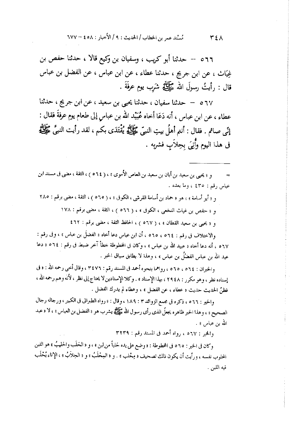 566 - حَدَّثَنَا أَبُو كُرَيْبٍ، وَسُفْيَانُ بْنُ وَكِيعٍ، قَالَا: حَدَّثَنَا حَفْصُ بْنُ غِيَاثٍ، عَنِ ابْنِ جُرَيْجٍ، حَدَّثَنَا عَطَاءٌ، عَنِ ابْنِ عَبَّاسٍ، عَنِ الْفَضْلِ بْنِ عَبَّاسٍ، قَالَ: «§رَأَيْتُ رَسُولَ اللَّهِ صَلَّى اللهُ عَلَيْهِ وَسَلَّمَ شَرِبَ يَوْمَ عَرَفَةَ»