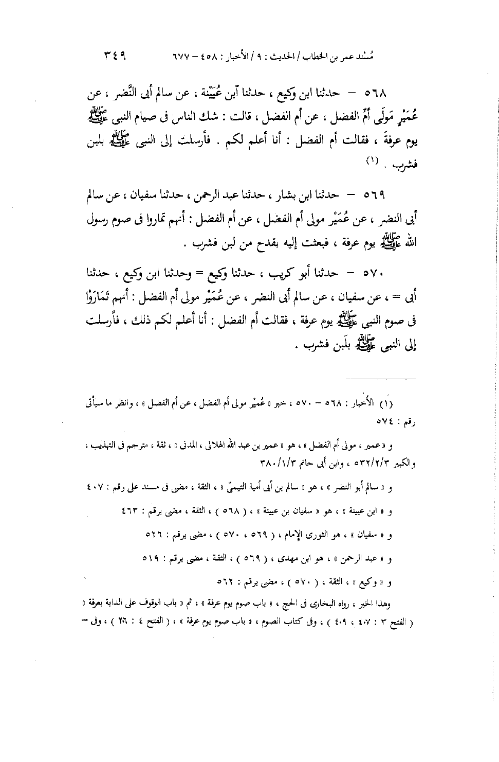 570 - حَدَّثَنَا أَبُو كُرَيْبٍ، حَدَّثَنَا وَكِيعٌ، وَحَدَّثَنَا ابْنُ وَكِيعٍ، حَدَّثَنَا أَبِي، عَنِ سُفْيَانَ، عَنْ سَالِمٍ أَبِي النَّضْرِ، عَنْ عُمَيْرٍ مَوْلَى أُمِّ الْفَضْلِ: " أَنَّهُمْ §تَمَارَوْا فِي صَوْمِ النَّبِيِّ صَلَّى اللهُ عَلَيْهِ وَسَلَّمَ يَوْمَ عَرَفَةَ، فَقَالَتْ أَمُّ الْفَضْلِ: أَنَا أَعْلَمُ لَكُمْ ذَلِكَ فَأَرْسَلَتْ إِلَى النَّبِيِّ صَلَّى اللهُ عَلَيْهِ وَسَلَّمَ بِلَبَنٍ، فَشَرِبَ "