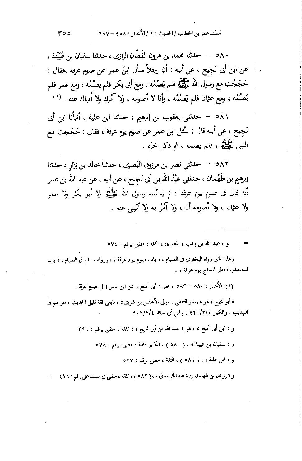 580 - حَدَّثَنَا مُحَمَّدُ بْنُ هَارُونَ الْقَطَّانُ الرَّازِيُّ، حَدَّثَنَا سُفْيَانُ بْنُ عُيَيْنَةَ، عَنِ ابْنِ أَبِي نَجِيحٍ، عَنْ أَبِيهِ، أَنَّ رَجُلًا سَأَلَ ابْنَ عُمَرَ عَنْ صَوْمِ عَرَفَةَ، فَقَالَ: «§حَجَجْتُ مَعَ رَسُولِ اللَّهِ صَلَّى اللهُ عَلَيْهِ وَسَلَّمَ فَلَمْ يَصُمْهُ، وَمَعَ أَبِي بَكْرٍ فَلَمْ يَصُمْهُ، وَمَعَ عُمَرَ فَلَمْ يَصُمْهُ، وَمَعَ عُثْمَانَ فَلَمْ يَصُمْهُ، وَأَنَا لَا أَصُومُهُ، وَلَا آمُرُكَ وَلَا أَنْهَاكَ عَنْهُ»