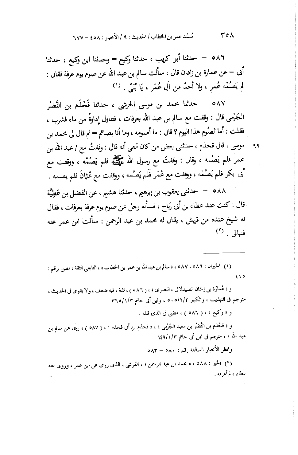 587 - حَدَّثَنَا مُحَمَّدُ بْنُ مُوسَى الْحَرَشِيُّ، حَدَّثَنَا قَحْذَمُ بْنُ النَّضْرِ الْجَرْمِيُّ، قَالَ: وَقَفْتُ مَعَ سَالِمِ بْنِ عَبْدِ اللَّهِ بِعَرَفَاتٍ، فَتَنَاوَلَ إِدَاوَةً مِنْ مَاءٍ فَشَرِبَ، فَقُلْتُ: أَمَا تَصُومُ هَذَا الْيَوْمَ؟ قَالَ: مَا أَصُومُهُ، وَمَا أَنَا بِصَائِمٍ. ثُمَّ قَالَ لِي مُحَمَّدُ بْنُ مُوسَى: قَالَ قَحْذَمٌ: حَدَّثَنِي بَعْضُ مَنْ كَانَ مَعِي أَنَّهُ قَالَ: " §وَقَفْتُ مَعَ عَبْدِ اللَّهِ بْنِ عُمَرَ فَلَمْ يَصُمْهُ، وَقَالَ: وَقَفْتُ مَعَ رَسُولِ اللَّهِ صَلَّى اللهُ عَلَيْهِ وَسَلَّمَ فَلَمْ يَصُمْهُ، وَوَقَفْتُ مَعَ أَبِي بَكْرٍ فَلَمْ يَصُمْهُ، وَوَقَفْتُ مَعَ عُمَرَ فَلَمْ يَصُمْهُ، وَوَقَفَتْ مَعَ عُثْمَانَ فَلَمْ يَصُمْهُ "