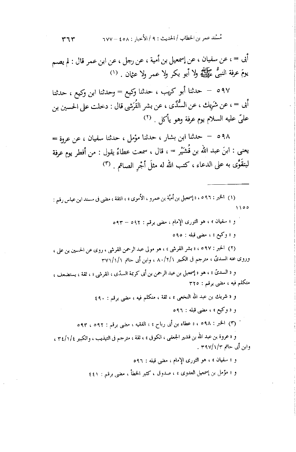 597 - حَدَّثَنَا أَبُو كُرَيْبٍ، حَدَّثَنَا وَكِيعٌ، وَحَدَّثَنَا ابْنُ وَكِيعٍ، حَدَّثَنَا أَبِي، عَنْ شَرِيكٍ، عَنِ السُّدِّيِّ، عَنْ بِشْرٍ الْقُرَشِيِّ، قَالَ: «§دَخَلْتُ عَلَى الْحُسَيْنِ بْنِ عَلِيٍّ عَلَيْهِ السَّلَامُ يَوْمَ عَرَفَةَ وَهُوَ يَأْكُلُ»