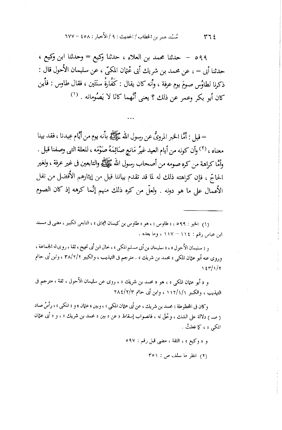 599 - حَدَّثَنَا مُحَمَّدُ بْنُ الْعَلَاءِ، حَدَّثَنَا وَكِيعٌ، وَحَدَّثَنَا ابْنُ وَكِيعٍ، حَدَّثَنَا أَبِي، عَنْ مُحَمَّدِ بْنِ شَرِيكٍ أَبِي عُثْمَانَ الْمَكِّيِّ، عَنْ سُلَيْمَانَ الْأَحْوَلِ، قَالَ: ذَكَرْنَا لِطَاوُسَ صَوْمَ يَوْمِ عَرَفَةَ، وَأَنَّهُ كَانَ يُقَالُ: كَفَّارَةُ سَنَتَيْنِ، فَقَالَ طَاوُسٌ: «§فَأَيْنَ كَانَ أَبُو بَكْرٍ وَعُمَرُ عَنْ ذَلِكَ؟ يَعْنِي أَنَّهُمَا كَانَا لَا يَصُومَانِهِ» قِيلَ: أَمَّا الْخَبَرُ الْمَرْوِيُّ عَنْ رَسُولِ اللَّهِ صَلَّى اللهُ عَلَيْهِ وَسَلَّمَ بِأَنَّهُ يَوْمٌ مِنْ أَيَّامِ عِيدِنَا، فَقَدْ بَيَّنَّا مَعْنَاهُ، وَأَنَّ كَوْنَهُ مِنْ أَيَّامِ الْعِيدِ غَيْرُ مَانِعٍ صَائِمَهُ صَوْمَهُ؛ لِلْعِلَّةِ الَّتِي وَصَفْنَا قَبْلُ. وَأَمَّا كَرَاهَةُ مَنْ كَرِهَ صَوْمَهُ مِنْ أَصْحَابِ رَسُولِ اللَّهِ صَلَّى اللهُ عَلَيْهِ وَسَلَّمَ وَالتَّابِعِينَ فِي غَيْرِ عَرَفَةَ، وَلِغَيْرِ الْحَاجِّ، فَإِنَّ كَرَاهَتَهُ ذَلِكَ لَهُ؛ لِمَا قَدْ تَقَدَّمَ بَيَانُنَا قَبْلُ مِنْ إِيثَارِهِمُ الْأَفْضَلَ مِنْ نَفْلِ الْأَعْمَالِ عَلَى مَا هُوَ دُونَهُ. وَلَعَلَّ مَنْ كَرِهَ ذَلِكَ مِنْهُمْ إِنَّمَا كَرِهَهُ إِذْ كَانَ الصَّوْمُ -[365]- يُضْعِفُ الْمُجْتَهِدَ عَنِ الِاجْتِهَادِ فِي الدُّعَاءِ، فَآثَرَ الْفِطْرَ لِيَتَقَوَّى بِهِ عَلَى الدُّعَاءِ، كَالَّذِي ذَكَرْنَا عَنْ عَطَاءٍ، وَسَعِيدِ بْنِ جُبَيْرٍ. وَبَعْدُ، فَإِنَّ كَرَاهَةَ الصَّوْمِ ذَلِكَ الْيَوْمَ لِمَنْ صَامَهُ غَيْرُ مُجْمَعٍ عَلَيْهِ، بَلْ ذَلِكَ مُخْتَلَفٌ فِيهِ. وَقَدِ اخْتَارَ صَوْمَهُ عَلَى إِفْطَارِهِ جَمَاعَةٌ مِنَ الصَّحَابَةِ وَالتَّابِعِينَ، حَتَّى لَقَدْ صَامَهُ جَمَاعَةٌ مِنْهُمْ بِعَرَفَةَ، فَفِي ذَلِكَ الدَّلِيلُ الْوَاضِحُ عَلَى صِحَّةِ قَوْلِنَا مِنْ أَنَّ إِفْطَارَ مَنْ أَفْطَرَ مِنْهُمْ، وَكَرَاهَةَ مَنْ كَرِهَ صَوْمَهُ مِنْهُمْ، إِنَّمَا كَانَ إِيثَارًا مِنْهُ غَيْرَهُ مِنْ نَفْلِ الْأَعْمَالِ عَلَيْهِ، وَإِبْقَاءً مِنْهُ عَلَى نَفْسِهِ لِيَتَقَوَّى بِالْإِفْطَارِ عَلَى الدُّعَاءِ، وَالِاجْتِهَادِ فِي الْعِبَادَةِ