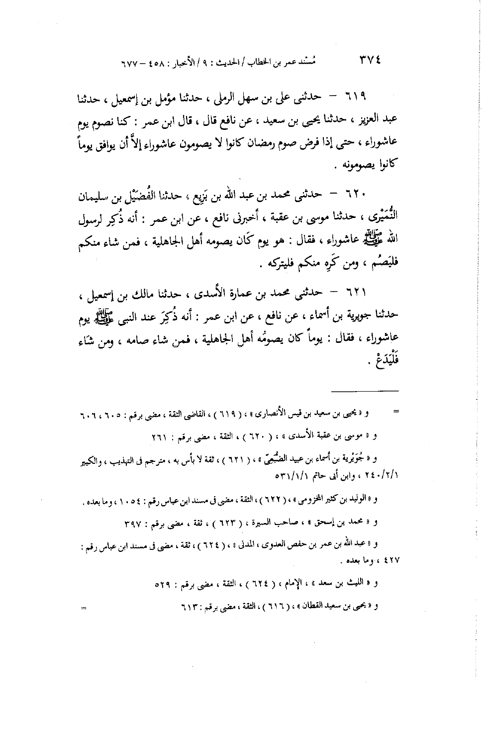 619 - حَدَّثَنِي عَلِيُّ بْنُ سَهْلٍ الرَّمْلِيُّ، حَدَّثَنَا مُؤَمَّلُ بْنُ إِسْمَاعِيلَ، حَدَّثَنَا عَبْدُ الْعَزِيزِ، حَدَّثَنَا يَحْيَى بْنُ سَعِيدٍ، عَنْ نَافِعٍ، قَالَ: قَالَ ابْنُ عُمَرَ: «§كُنَّا نَصُومُ يَوْمَ عَاشُورَاءَ، حَتَّى إِذَا فُرِضَ صَوْمُ رَمَضَانَ، كَانُوا لَا يَصُومُونَ عَاشُورَاءَ إِلَّا أَنْ يُوَافِقَ يَوْمًا كَانُوا يَصُومُونَهُ»