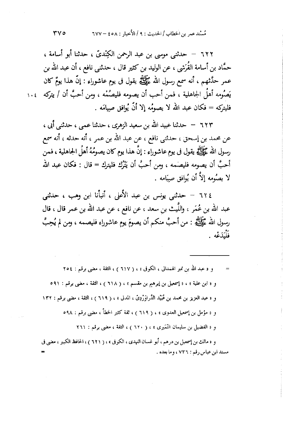 622 - حَدَّثَنِي مُوسَى بْنُ عَبْدِ الرَّحْمَنِ الْكِنْدِيُّ، حَدَّثَنَا أَبُو أُسَامَةَ حَمَّادُ بْنُ أُسَامَةَ الْقُرَشِيُّ، عَنِ الْوَلِيدِ بْنِ كَثِيرٍ، قَالَ: حَدَّثَنِي نَافِعٌ: أَنَّ عَبْدَ اللَّهِ بْنَ عُمَرَ حَدَّثَهُمْ أَنَّهُ سَمِعَ رَسُولَ اللَّهِ صَلَّى اللهُ عَلَيْهِ وَسَلَّمَ يَقُولُ فِي يَوْمِ عَاشُورَاءُ: «إِنَّ §هَذَا يَوْمٌ كَانَ يَصُومُهُ أَهْلُ الْجَاهِلِيَّةِ، فَمَنْ أَحَبَّ أَنْ يَصُومَهُ فَلْيَصُمْهُ، وَمَنْ أَحَبَّ أَنْ يَتْرُكَهُ فَلْيَتْرُكْهُ» فَكَانَ عَبْدُ اللَّهِ لَا يَصُومُهُ إِلَّا أَنْ يُوَافِقَ صِيَامَهُ