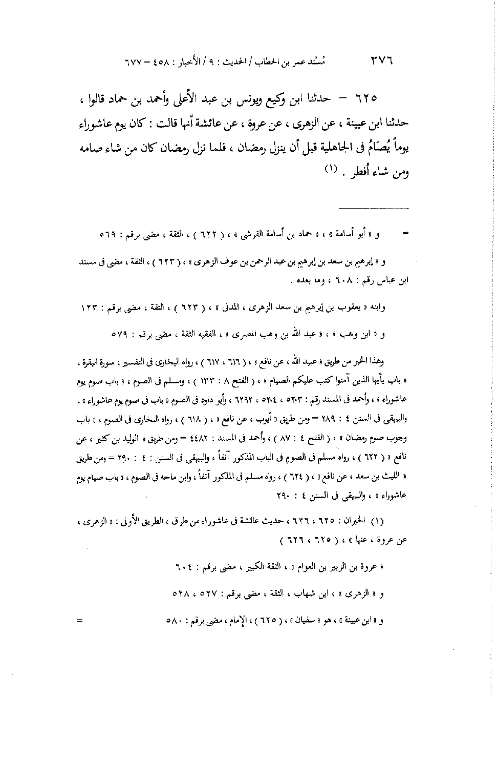 625 - حَدَّثَنَا ابْنُ وَكِيعٍ، وَيُونُسُ بْنُ عَبْدِ الْأَعْلَى، وَأَحْمَدُ بْنُ حَمَّادٍ، قَالُوا: حَدَّثَنَا ابْنُ عُيَيْنَةَ، عَنِ الزُّهْرِيِّ، عَنْ عُرْوَةَ، عَنْ عَائِشَةَ، أَنَّهَا قَالَتْ: «كَانَ §يَوْمُ عَاشُورَاءَ يَوْمًا يُصَامُ فِي الْجَاهِلِيَّةِ قَبْلَ أَنْ يَنْزِلَ رَمَضَانُ، فَلَمَّا نَزَلَ رَمَضَانُ كَانَ مَنْ شَاءَ صَامَهُ، وَمَنْ شَاءَ أَفْطَرَ»