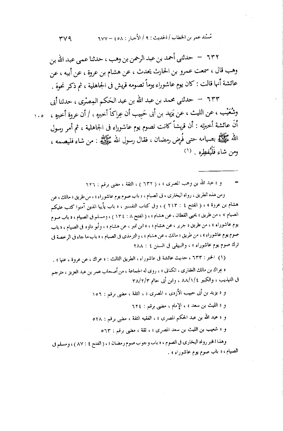 633 - حَدَّثَنِي مُحَمَّدُ بْنُ عَبْدِ اللَّهِ بْنِ عَبْدِ الْحَكَمِ الْمِصْرِيُّ، حَدَّثَنَا أَبِي، وَشُعَيْبٌ، عَنِ اللَّيْثِ، عَنْ يَزِيدَ بْنِ أَبِي حَبِيبٍ: أَنَّ عِرَاكًا، أَخْبَرَهُ أَنَّ عُرْوَةَ أَخْبَرَهُ: أَنَّ عَائِشَةَ أَخْبَرَتْهُ: أَنَّ قُرَيْشًا كَانَتْ تَصُومُ يَوْمَ عَاشُورَاءَ فِي الْجَاهِلِيَّةِ، ثُمَّ أَمَرُ رَسُولُ اللَّهِ صَلَّى اللهُ عَلَيْهِ وَسَلَّمَ بِصِيَامِهِ حَتَّى فُرِضَ رَمَضَانُ، فَقَالَ رَسُولُ اللَّهِ صَلَّى اللهُ عَلَيْهِ وَسَلَّمَ: «§مَنْ شَاءَ فَلْيَصُمْهُ، وَمَنْ شَاءَ فَلْيُفْطِرْهُ»