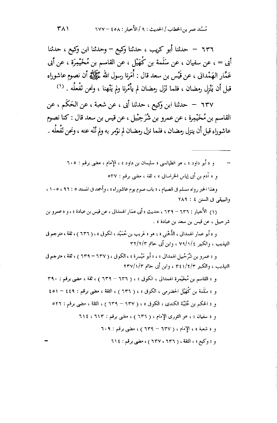 637 - حَدَّثَنَا ابْنُ وَكِيعٍ، حَدَّثَنَا أَبِي، عَنْ شُعْبَةَ، عَنِ الْحَكَمِ، عَنِ الْقَاسِمِ بْنِ مُخَيْمِرَةَ، عَنْ عَمْرِو بْنِ شُرَحْبِيلَ، عَنْ قَيْسِ بْنِ سَعْدٍ، قَالَ: «§كُنَّا نَصُومُ عَاشُورَاءَ قَبْلَ أَنْ يَنْزِلَ رَمَضَانُ، فَلَمَّا نَزَلَ رَمَضَانُ لَمْ نُؤْمَرْ بِهِ، وَلَمْ نُنْهَ عَنْهُ، وَنَحْنُ نَفْعَلُهُ»