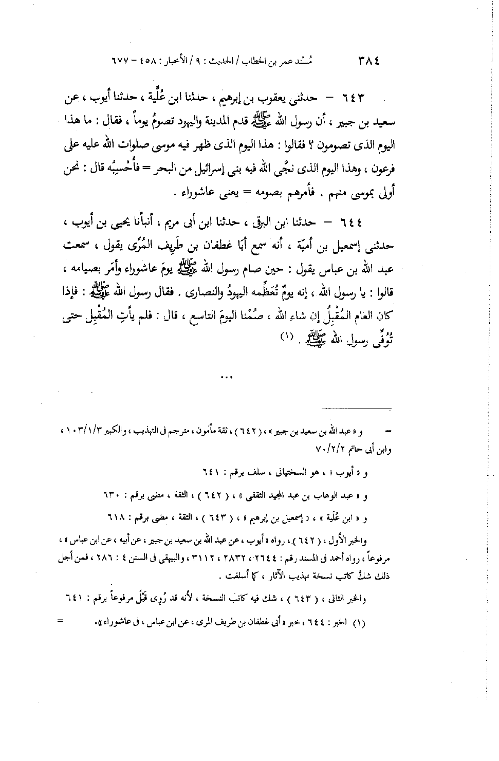 643 - حَدَّثَنِي يَعْقُوبُ بْنُ إِبْرَاهِيمَ، حَدَّثَنَا ابْنُ عُلَيَّةَ، حَدَّثَنَا أَيُّوبُ، عَنْ سَعِيدِ بْنِ جُبَيْرٍ أَنَّ رَسُولَ اللَّهِ صَلَّى اللهُ عَلَيْهِ وَسَلَّمَ قَدِمَ الْمَدِينَةَ وَالْيَهُودُ تَصُومُ يَوْمًا، فَقَالَ: «§مَا هَذَا الْيَوْمُ الَّذِي تَصُومُونَ» ؟ فَقَالُوا: هَذَا الْيَوْمُ الَّذِي ظَهَرَ فِيهِ مُوسَى صَلَوَاتُ اللَّهِ عَلَيْهِ عَلَى فِرْعَوْنَ، وَهَذَا الْيَوْمُ الَّذِي نَجَّى اللَّهُ فِيهِ بَنِي إِسْرَائِيلَ مِنَ الْبَحْرِ. فَأَحْسِبُهُ قَالَ: «نَحْنُ أَوْلَى بِمُوسَى مِنْهُمْ» . فَأَمَرَهُمْ بِصَوْمِهِ يَعْنِي عَاشُورَاءَ