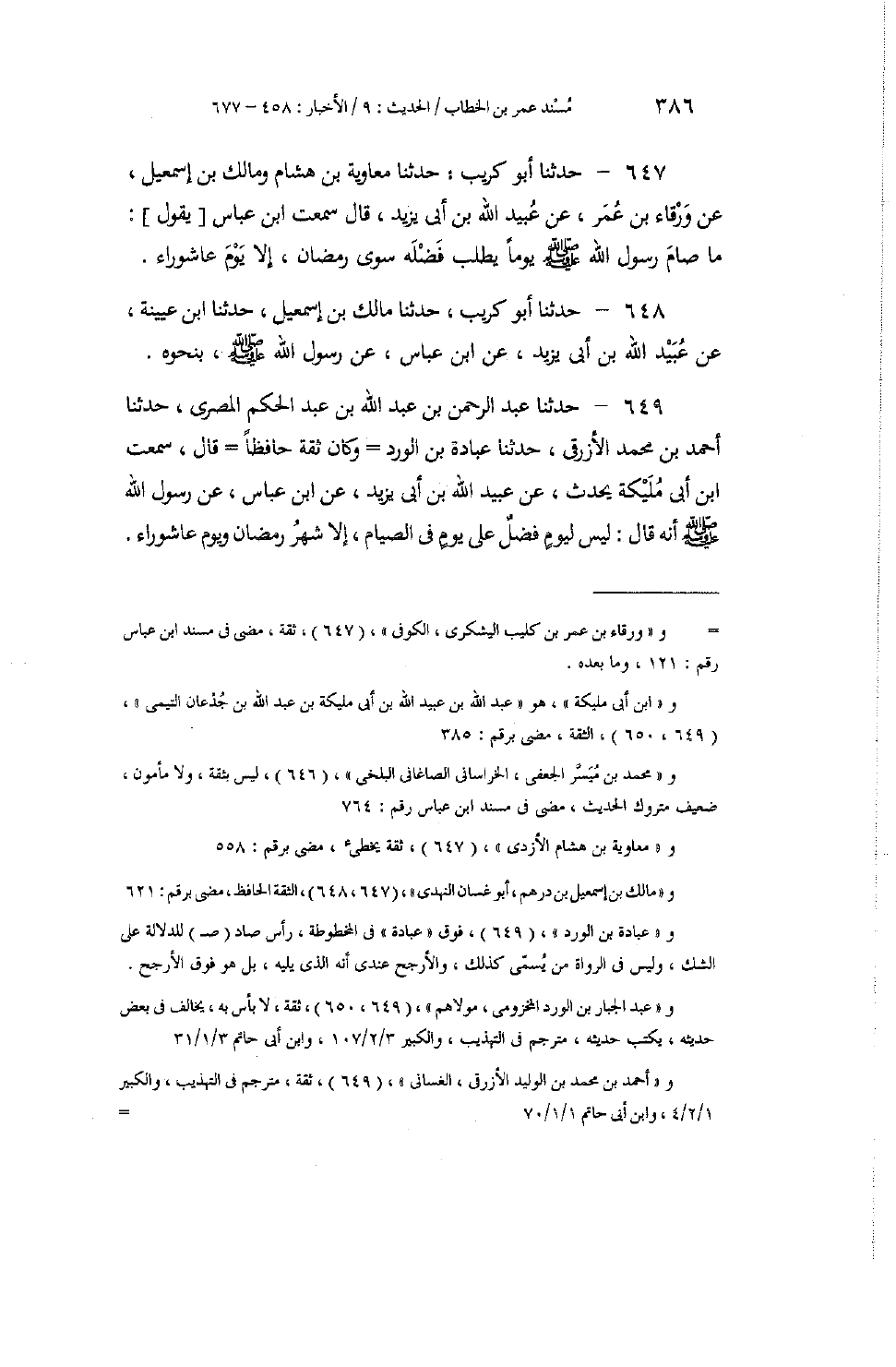 649 - حَدَّثَنَا عَبْدُ الرَّحْمَنِ بْنُ عَبْدِ اللَّهِ بْنِ عَبْدِ الْحَكَمِ الْمِصْرِيُّ، حَدَّثَنَا أَحْمَدُ بْنُ مُحَمَّدٍ الْأَزْرَقِيُّ، حَدَّثَنَا عُبَادَةُ بْنُ الْوَرْدِ، وَكَانَ ثِقَةً حَافِظًا قَالَ: سَمِعْتُ ابْنَ أَبِي مُلَيْكَةَ يُحَدِّثُ عَنْ عُبَيْدِ اللَّهِ بْنِ أَبِي يَزِيدَ، عَنِ ابْنِ عَبَّاسٍ عَنْ رَسُولِ اللَّهِ صَلَّى اللهُ عَلَيْهِ وَسَلَّمَ أَنَّهُ قَالَ: «§لَيْسَ لِيَوْمٍ فَضْلٌ عَلَى يَوْمٍ فِي الصِّيَامِ إِلَّا شَهْرَ رَمَضَانَ وَيَوْمَ عَاشُورَاءَ»