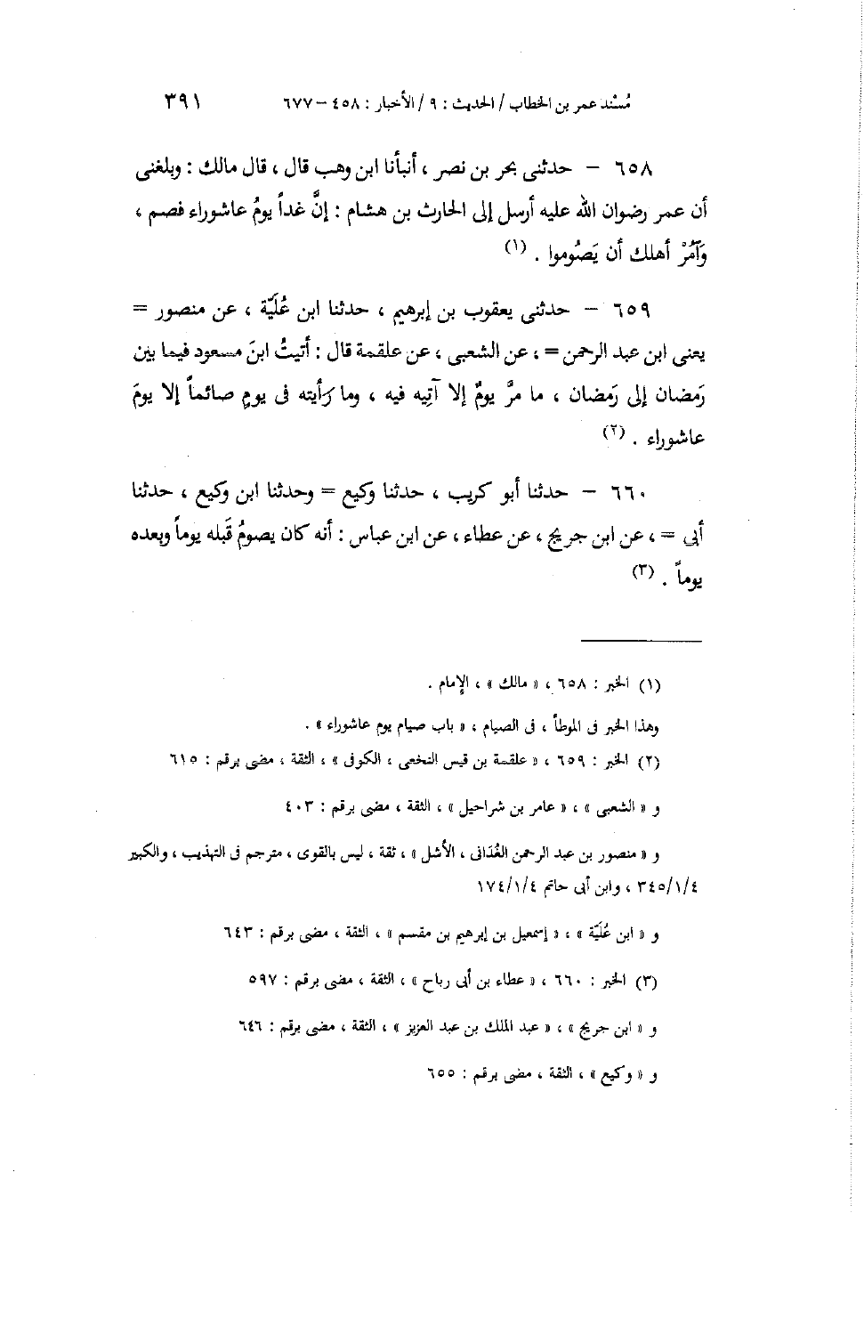 658 - حَدَّثَنِي بَحْرُ بْنُ نَصْرٍ، أَنْبَأَنَا ابْنُ وَهْبٍ، قَالَ: قَالَ مَالِكٌ: وَبَلَغَنِي أَنَّ عُمَرَ رِضْوَانُ اللَّهِ عَلَيْهِ أَرْسَلَ إِلَى الْحَارِثِ بْنِ هِشَامٍ: «إِنَّ §غَدًا يَوْمُ عَاشُورَاءَ فَصُمْ، وَأْمُرْ أَهْلَكَ أَنْ يَصُومُوا»
