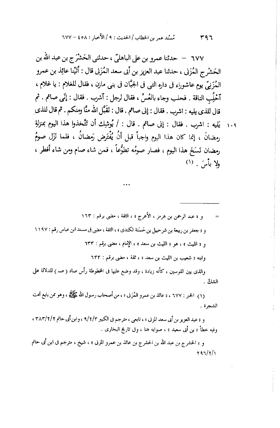 677 - حَدَّثَنَا عَمْرُو بْنُ عَلِيٍّ الْبَاهِلِيُّ، حَدَّثَنِي الْحَشْرَجُ بْنُ عَبْدِ اللَّهِ بْنِ الْحَشْرَجِ الْمُزَنِيُّ، حَدَّثَنَا عَبْدُ الْعَزِيزِ بْنُ أَبِي سَعْدٍ الْمُزَنِيُّ، قَالَ: أَتَيْنَا عَائِذَ بْنَ عَمْرٍو الْمُزَنِيَّ يَوْمَ عَاشُورَاءَ فِي دَارِهِ الَّتِي فِي الْجَبَّانِ فِي بَنِي مَازِنٍ، فَقَالَ لِلْغُلَامِ: «يَا غُلَامُ، احْلِبِ النَّاقَةَ» فَحَلَبَ وَجَاءَ بِالْعُسِّ، فَقَالَ لِرَجُلٍ: «اشْرَبْ» ، فَقَالَ: إِنِّي صَائِمٌ. ثُمَّ قَالَ لِلَّذِي يَلِيهِ: «اشْرَبْ» ، فَقَالَ: إِنِّي صَائِمٌ. قَالَ: «تَقَبَّلَ اللَّهُ مِنَّا وَمِنْكُمْ» ثُمَّ قَالَ لِلَّذِي يَلِيهِ: «اشْرَبْ» ، فَقَالَ: إِنِّي صَائِمٌ. قَالَ: «§يُوشِكُ أَنْ تَتَّخِذُوا هَذَا الْيَوْمَ بِمَنْزِلَةِ رَمَضَانَ، إِنَّمَا كَانَ هَذَا الْيَوْمُ وَاجِبًا قَبْلَ أَنْ يُفْتَرَضَ رَمَضَانُ، فَلَمَّا نَزَلَ صَوْمُ رَمَضَانَ نَسَخَ هَذَا الْيَوْمَ، فَصَارَ صَوْمُهُ تَطَوُّعًا، فَمَنْ شَاءَ صَامَ، وَمَنْ شَاءَ أَفْطَرَ، وَلَا بَأْسَ» -[397]- وَالصَّوَابُ مِنَ الْقَوْلِ فِي ذَلِكَ عِنْدَنَا أَنْ يُقَالَ: إِنَّ صَوْمَ يَوْمِ عَاشُورَاءَ كَانَ مِمَّا أَمَرَ بِهِ النَّبِيُّ صَلَّى اللهُ عَلَيْهِ وَسَلَّمَ أُمَّتَهُ قَبْلَ نُزُولِ فَرْضِ شَهْرِ رَمَضَانَ، كَالَّذِي تَتَابَعَتْ بِهِ الْأَخْبَارُ الَّتِي ذَكَرْنَاهَا قَبْلُ عَنْ أَصْحَابِ رَسُولِ اللَّهِ صَلَّى اللهُ عَلَيْهِ وَسَلَّمَ، كَانَ يَأْمُرُهُمْ بِذَلِكَ قَبْلَ وجُوبِ صَوْمِ شَهْرِ رَمَضَانَ، فَلَمَّا فَرَضَ اللَّهُ عَزَّ وَجَلَّ عَلَى رَسُولِهِ صَلَّى اللهُ عَلَيْهِ وَسَلَّمَ وَالْمُؤْمِنِينَ بِهِ صَوْمَ شَهْرِ رَمَضَانَ، لَمْ يَنْهَهُمْ عَنْ صَوْمِهِ، وَلَمْ يَأْمُرْهُمْ بِصَوْمِهِ الْأَمْرَ الَّذِي كَانَ يَأْمُرَهُمْ بِهِ قَبْلَ وجُوبِ صَوْمِ شَهْرِ رَمَضَانَ، وَلَكِنَّهُ كَانَ يَنْدُبُهُمْ إِلَى صَوْمِهِ، بِتَعْرِيفِهِ إِيَّاهُمْ مَا لَهُمْ فِيهِ مِنَ الْأَجْرِ وَالثَّوَابِ، فَمَنْ صَامَهُ طَالِبًا بِهِ الْأَجْرَ مِنَ اللَّهِ عَزَّ وَجَلَّ، مُتَحَرِّيًا بِصَوْمِهِ إِدْرَاكَ مَا وَعَدَ اللَّهُ تَعَالَى صَائِمِيهِ عَلَى لِسَانِ رَسُولِهِ صَلَّى اللهُ عَلَيْهِ وَسَلَّمَ مِنَ الثَّوَابِ، رَجَوْنَا لَهُ إِدْرَاكَ مَا أَمَّلَ وَرَجَا بِهِ مِنَ اللَّهِ تَعَالَى، وَمَنْ تَرَكَ صَوْمَهُ، وَآثَرَ الْإِفْطَارَ فِيهِ عَلَى صَوْمِهِ؛ إِيثَارًا مِنْهُ مَا هُوَ أَفْضَلُ مِنْهُ مِنَ الْأَعْمَالِ عَلَيْهِ، رَجَوْنَا لَهُ أَيْضًا بِذَلِكَ أَنْ يُدْرِكَ مَا أَمَّلَ بِإِفْطَارِهِ وَإِيثَارِ غَيْرِهِ مِنَ الْعَمَلِ الَّذِي هُوَ أَفْضَلُ عَلَيْهِ، وَمَنْ أَفْطَرَهُ لِقَوْلِي ذَلِكَ، فَإِنَّمَا هُوَ تَارِكُ فَضْلٍ، لَا لومَ عَلَيْهِ فِي تَرْكِهِ. فَإِنْ قَالَ لَنَا قَائِلٌ: فَمَا وَجْهُ كَرَاهَةِ مَنْ كَرِهَ صَوْمَهُ مِنْ أَصْحَابِ رَسُولِ اللَّهِ صَلَّى اللهُ عَلَيْهِ وَسَلَّمَ وَغَيْرِهِمْ؟ قِيلَ: وَجْهُ كَرَاهَتِهِمْ ذَلِكَ نَظِيرُ كَرَاهَةِ مَنْ كَرِهَ صَوْمَ رَجَبٍ؛ إِذْ كَانَ شَهْرًا كَانَتِ الْجَاهِلِيَّةُ تُعَظِّمُهُ، فَكَرِهَ مَنْ كَرِهَ صَوْمَهُ أَنْ يُعَظِّمَهُ فِي الْإِسْلَامِ بِصَوْمِهِ تَعْظِيمَ أَهْلِ الْجَاهِلِيَّةِ إِيَّاهُ فِي الشِّرْكِ، فَأَرَادَ بِإِفْطَارِهِ وَضْعَ مَنَارِ الْكُفْرِ، وَهَدْمَ أَعْلَامِ الشِّرْكِ. وَكَذَلِكَ عَاشُورَاءُ، كَانَ - كَمَا قَدْ ذَكَرْنَا الْخَبَرَ قَبْلُ عَمَّنْ ذَكَرْنَا ذَلِكَ عَنْهُ - يَوْمًا يَصُومُهُ أَهْلُ الشِّرْكِ فِي الْجَاهِلِيَّةِ، فَأَرَادَ بِإِفْطَارِهِ وَالنَّهْيِ عَنْ صَوْمِهِ - مَنْ أَفْطَرَهُ وَكَرِهَ صَوْمَهُ - إِبْطَالَ مَا أَبْطَلَهُ اللَّهُ تَعَالَى بِمَا شَرَعَ لِعِبَادِهِ م