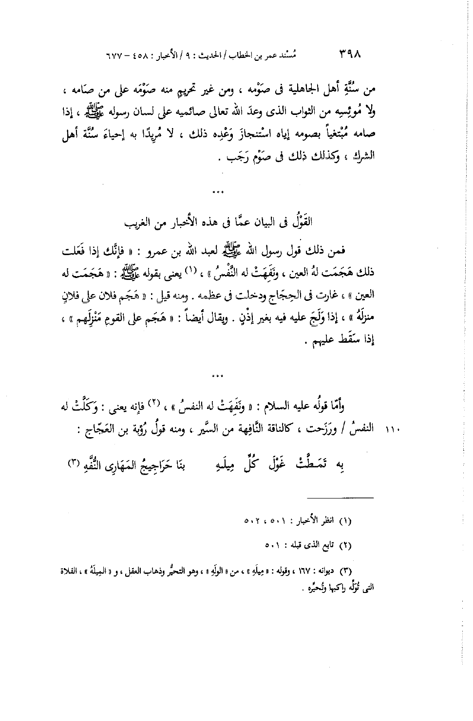 §الْقَوْلُ فِي الْبَيَانِ عَمَّا فِي هَذِهِ الْأَخْبَارِ مِنَ الْغَرِيبِ فَمِنْ ذَلِكَ قَوْلُ رَسُولِ اللَّهِ صَلَّى اللهُ عَلَيْهِ وَسَلَّمَ لِعَبْدِ اللَّهِ بْنِ عَمْرٍو: «فَإِنَّكَ إِذَا فَعَلْتَ ذَلِكَ هَجَمَتْ لَهُ الْعَيْنُ، وَنَفِهَتْ لَهُ النَّفْسُ» ، يَعْنِي بِقَوْلِهِ صَلَّى اللهُ عَلَيْهِ وَسَلَّمَ: «هَجَمَتْ لَهُ الْعَيْنُ» : غَارَتْ فِي الْحِجَاجِ، وَدَخَلَتْ فِي عَظْمِهِ. وَمِنْهُ قِيلَ: هَجَمَ فُلَانٌ عَلَى فُلَانٍ مَنْزِلَهُ: إِذَا وَلَجَ عَلَيْهِ فِيهِ بِغَيْرِ إِذْنٍ. وَيُقَالُ أَيْضًا: هَجَمَ عَلَى الْقَوْمِ مَنْزِلَهُمْ: إِذَا سَقَطَ عَلَيْهِمْ وَأَمَّا قَوْلُهُ عَلَيْهِ السَّلَامُ: «وَنَفِهَتْ لَهُ النَّفْسَ» ، فَإِنَّهُ يَعْنِي: وَكَلَّتْ لَهُ النَّفْسُ وَرَزَحَتْ، كَالنَّاقَةِ النَّافِهَةِ مِنَ السَّيْرِ. وَمِنْهُ قَوْلُ رُؤْبَةَ بْنِ الْعَجَّاجِ: