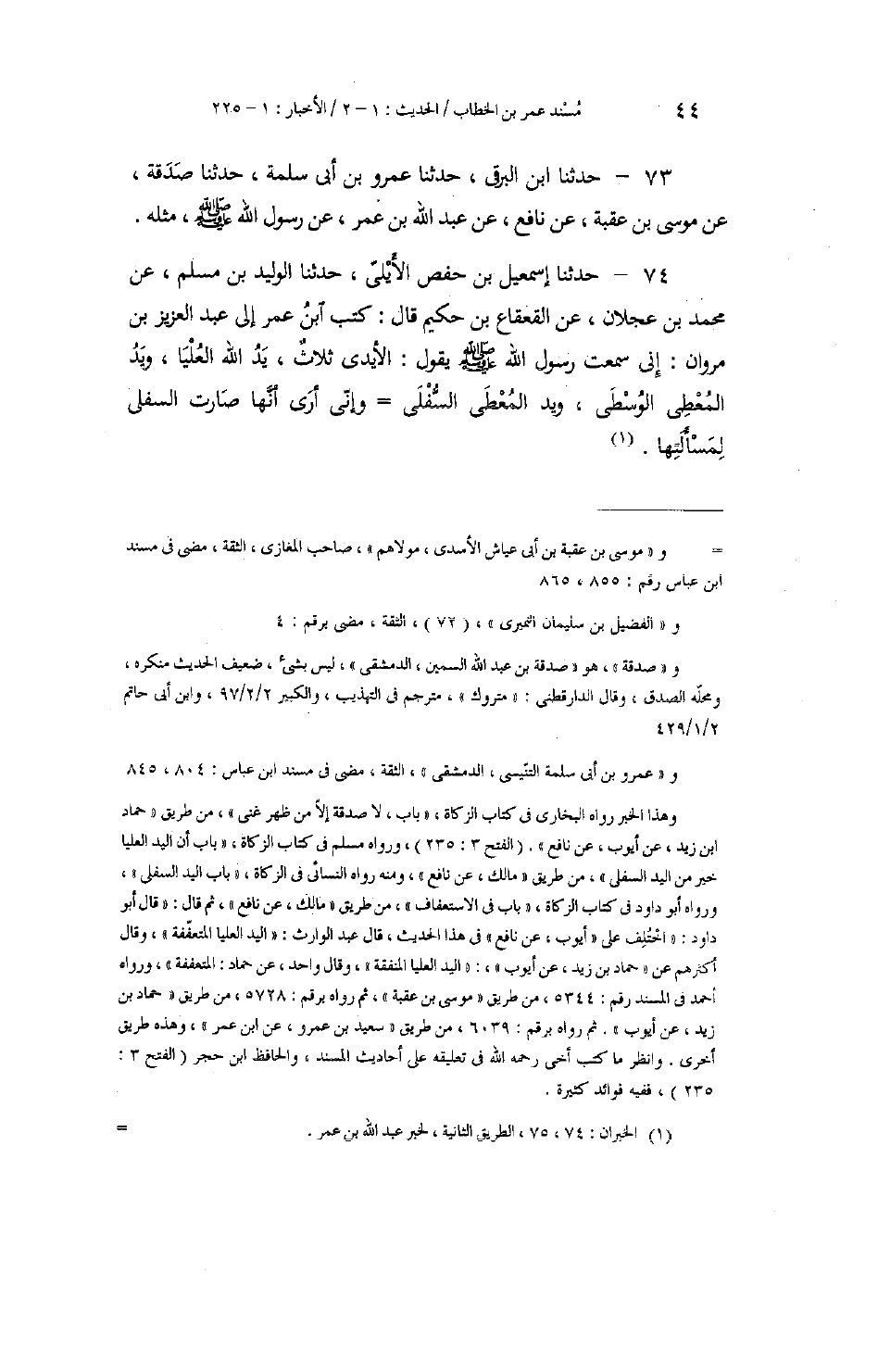 74 - حَدَّثَنَا إِسْمَاعِيلُ بْنُ حَفْصٍ الْأَيْلِيُّ، حَدَّثَنَا الْوَلِيدُ بْنُ مُسْلِمٍ، عَنْ مُحَمَّدِ بْنِ عَجْلَانَ، عَنِ الْقَعْقَاعِ بْنِ حَكِيمٍ، قَالَ: كَتَبَ ابْنُ عُمَرَ إِلَى عَبْدِ الْعَزِيزِ بْنِ مَرْوَانَ: إِنِّي سَمِعْتُ رَسُولَ اللَّهِ صَلَّى اللهُ عَلَيْهِ وَسَلَّمَ يَقُولُ: " §الْأَيْدِي ثَلَاثٌ: يَدُ اللَّهِ الْعُلْيَا، وَيَدُ الْمُعْطِي الْوُسْطَى، وَيَدُ الْمُعْطَى السُّفْلَى «، وَإِنِّي أَرَى أَنَّهَا صَارَتِ السُّفْلَى لِمَسْأَلَتِهَا»