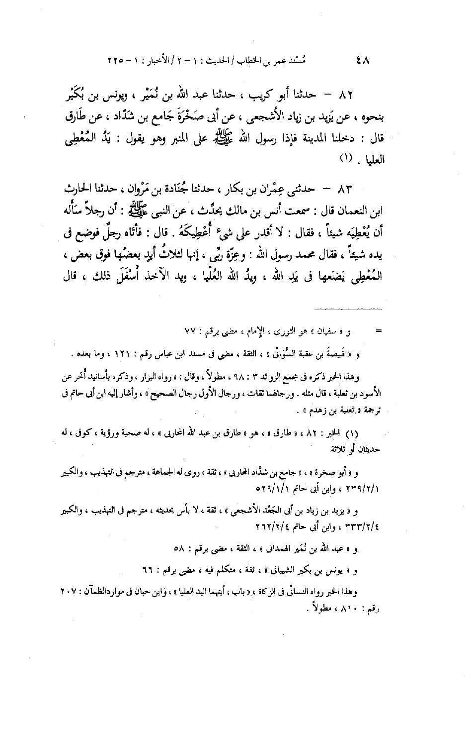 83 - حَدَّثَنِي عِمْرَانُ بْنُ بَكَّارٍ، حَدَّثَنَا جُنَادَةُ بْنُ مَرْوَانَ، حَدَّثَنَا الْحَارِثُ بْنُ النُّعْمَانِ، قَالَ: سَمِعْتُ أَنَسَ بْنَ مَالِكٍ يُحَدِّثُ عَنِ النَّبِيِّ صَلَّى اللهُ عَلَيْهِ وَسَلَّمَ أَنَّ رَجُلًا سَأَلَهُ أَنْ يُعْطِيَهُ شَيْئًا، فَقَالَ: «§لَا أَقْدِرُ عَلَى شَيْءٍ أُعْطِيكَهُ» . قَالَ: فَأَتَاهُ رَجُلٌ فَوَضَعَ فِي يَدِهِ شَيْئًا، فَقَالَ مُحَمَّدٌ رَسُولُ اللَّهِ: " وَعِزَّةِ رَبِّي، إِنَّهَا لَثَلَاثُ أَيْدٍ بَعْضُهَا فَوْقَ بَعْضٍ: الْمُعْطِي يَضَعُهَا فِي يَدِ اللَّهِ، وَيَدُ اللَّهِ الْعُلْيَا، وَيَدُ الْآخِذِ أَسْفَلَ ذَلِكَ. قَالَ -[49]- رَبِّي: بِعِزَّتِي، عَبْدِي، لَأَنْفُسَنَّكَ بِمَا رَحِمْتَ عَبْدِي، وبِعِزَّتِي، عَبْدِي، لَأَجْزِيَنَّكَ بِمَا رَحِمْتَ عَبْدِي، وبِعِزَّتِي، عَبْدِي، لَأُخْلِفَنَّ بِهَا عَلَيْكَ رَحْمَةً مِنْ عِنْدِي "