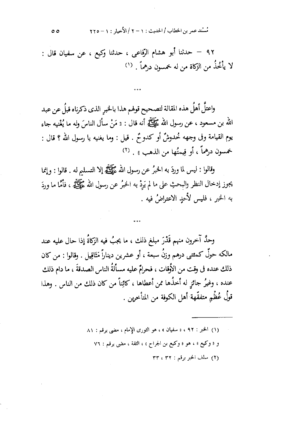 92 - حَدَّثَنَا أَبُو هِشَامٍ الرِّفَاعِيُّ، حَدَّثَنَا وَكِيعٌ، عَنْ سُفْيَانَ، قَالَ: لَا يَأْخُذُ مِنَ الزَّكَاةِ مَنْ لَهُ خَمْسُونَ دِرْهَمًا. وَاعْتَلَّ أَهْلُ هَذِهِ الْمَقَالَةِ لِتَصْحِيحِ قَوْلِهِمْ هَذَا بِالْخَبَرِ الَّذِي ذَكَرْنَاهُ قَبْلُ عَنْ عَبْدِ اللَّهِ بْنِ مَسْعُودٍ، عَنْ رَسُولِ اللَّهِ صَلَّى اللهُ عَلَيْهِ وَسَلَّمَ أَنَّهُ قَالَ: " §مَنْ سَأَلَ النَّاسَ وَلَهُ مَا يُغْنِيهِ جَاءَ يَوْمَ الْقِيَامَةِ وَفِي وَجْهِهِ خُدُوشٌ أَوْ كُدُوحٌ، قِيلَ: وَمَا يُغْنِيهِ يَا رَسُولَ اللَّهِ؟ قَالَ: خَمْسُونَ دِرْهَمًا، أَوْ قِيمَتُهَا مِنَ الذَّهَبِ " وَقَالُوا: لَيْسَ لِمَا وَرَدَ بِهِ الْخَبَرُ عَنْ رَسُولِ اللَّهِ صَلَّى اللهُ عَلَيْهِ وَسَلَّمَ إِلَّا التَّسْلِيمُ لَهُ، قَالُوا: وَإِنَّمَا يَجُوزُ إِدْخَالُ النَّظَرِ وَالْبَحْثِ عَلَى مَا لَمْ يَرِدْ بِهِ الْخَبَرُ عَنْ رَسُولِ اللَّهِ صَلَّى اللهُ عَلَيْهِ وَسَلَّمَ، فَأَمَّا مَا وَرَدَ بِهِ الْخَبَرُ فَلَيْسَ لِأَحَدٍ الِاعْتِرَاضُ فِيهِ. وَحَدَّ آخَرُونَ مِنْهُمْ قَدْرَ مَبْلَغِ ذَلِكَ، مَا يَجِبُ فِيهِ الزَّكَاةُ إِذَا حَالَ عَلَيْهِ عِنْدَ مَالِكِهِ حَوْلٌ كَمِائَتَيْ دِرْهَمٍ وَزْنُ سَبْعَةٍ، أَوْ عِشْرِينَ دِينَارًا مَثَاقِيلَ وَقَالُوا: مَنْ كَانَ ذَلِكَ عِنْدَهُ فِي وَقْتٍ مِنَ الْأَوْقَاتِ فَحَرَامٌ عَلَيْهِ مَسْأَلَةُ النَّاسِ الصَّدَقَةَ مَا دَامَ ذَلِكَ عِنْدَهُ، وَغَيْرُ جَائِزٍ لَهُ أَخَذُهَا مِمَّنْ أَعْطَاهُمْ كَائِنًا مَنْ كَانَ ذَلِكَ مِنَ النَّاسِ، وَهَذَا قَوْلُ عُظْمِ مُتَفَقِّهَةِ أَهْلِ الْكُوفَةِ مِنَ الْمُتَأَخِّرِينَ -[56]-. وَاعْتَلُّوا لِقَوْلِهِمْ هَذَا بِأَنْ قَالُوا: إِنَّ اللَّهَ تَعَالَى ذِكْرُهُ أَمَرَ نَبِيَّهُ صَلَّى اللهُ عَلَيْهِ وَسَلَّمَ أَنْ يَأْخُذَ الصَّدَقَةَ مِنْ أَغْنِيَاءِ الْمُؤْمِنِينَ فَيَرُدَّهَا فِي فُقَرَائِهِمْ، قَالُوا: وَمَنْ كَانَ عِنْدَهُ مِائَتَا دِرْهَمٍ قَدْ حَالَ عَلَيْهِمْ حَوْلٌ كَامِلٌ، فَلَا شَكَّ فِي وجُوبِ الصَّدَقَةِ عَلَيْهِ فِيهَا. قَالُوا: فَفِي ذَلِكَ بَيَانٌ وَاضِحٌ أَنَّهُ بِهَا غَنِيٌّ؛ لِأَنَّ الصَّدَقَةَ إِنَّمَا أَوْجَبَهَا اللَّهُ عَزَّ وَجَلَّ فِي أَمْوَالِ الْأَغْنِيَاءِ لِلْفُقَرَاءِ وَالْمَسَاكِينِ، لَا فِي أَمْوَالِ الْفُقَرَاءِ وَالْمَسَاكِينِ لَهُمْ، قَالُوا: فَعَلِمْنَا بِذَلِكَ أَنَّ مَنْ كَانَ عِنْدَهُ قَدْرُ مَا ذَكَرْنَا حَرَامٌ عَلَيْهِ الْمَسْأَلَةُ وَالصَّدَقَةُ، وَمُبَاحٌ ذَلِكَ لِمَنْ لَمْ يَكُنْ ذَلِكَ عِنْدَهُ