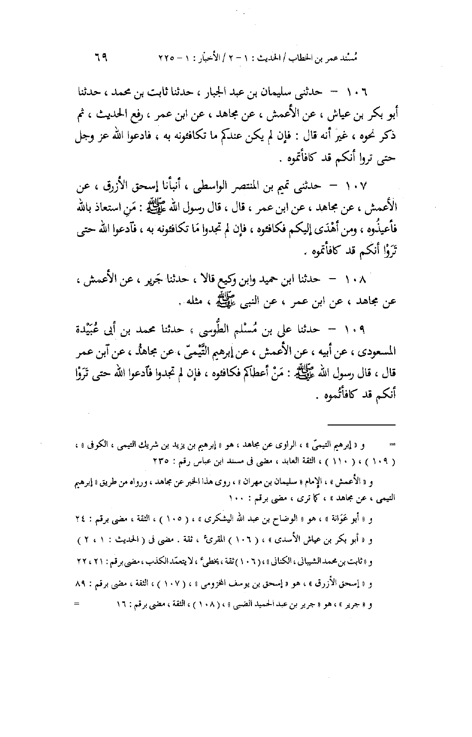109 - حَدَّثَنَا عَلِيُّ بْنُ مُسْلِمٍ الطُّوسِيُّ، حَدَّثَنَا مُحَمَّدُ بْنُ أَبِي عُبَيْدَةَ الْمَسْعُودِيُّ، عَنْ أَبِيهِ، عَنِ الْأَعْمَشِ، عَنْ إِبْرَاهِيمَ التَّيْمِيِّ، عَنْ مُجَاهِدٍ، عَنِ ابْنِ عُمَرَ، قَالَ: قَالَ رَسُولُ اللَّهِ صَلَّى اللهُ عَلَيْهِ وَسَلَّمَ: «§مَنْ أَعْطَاكُمْ فَكَافِئُوهُ، فَإِنْ لَمْ تَجِدُوا فَادْعُوا اللَّهَ حَتَّى تَرَوْا أَنَّكُمْ قَدْ كَافَأْتُمُوهُ» ،