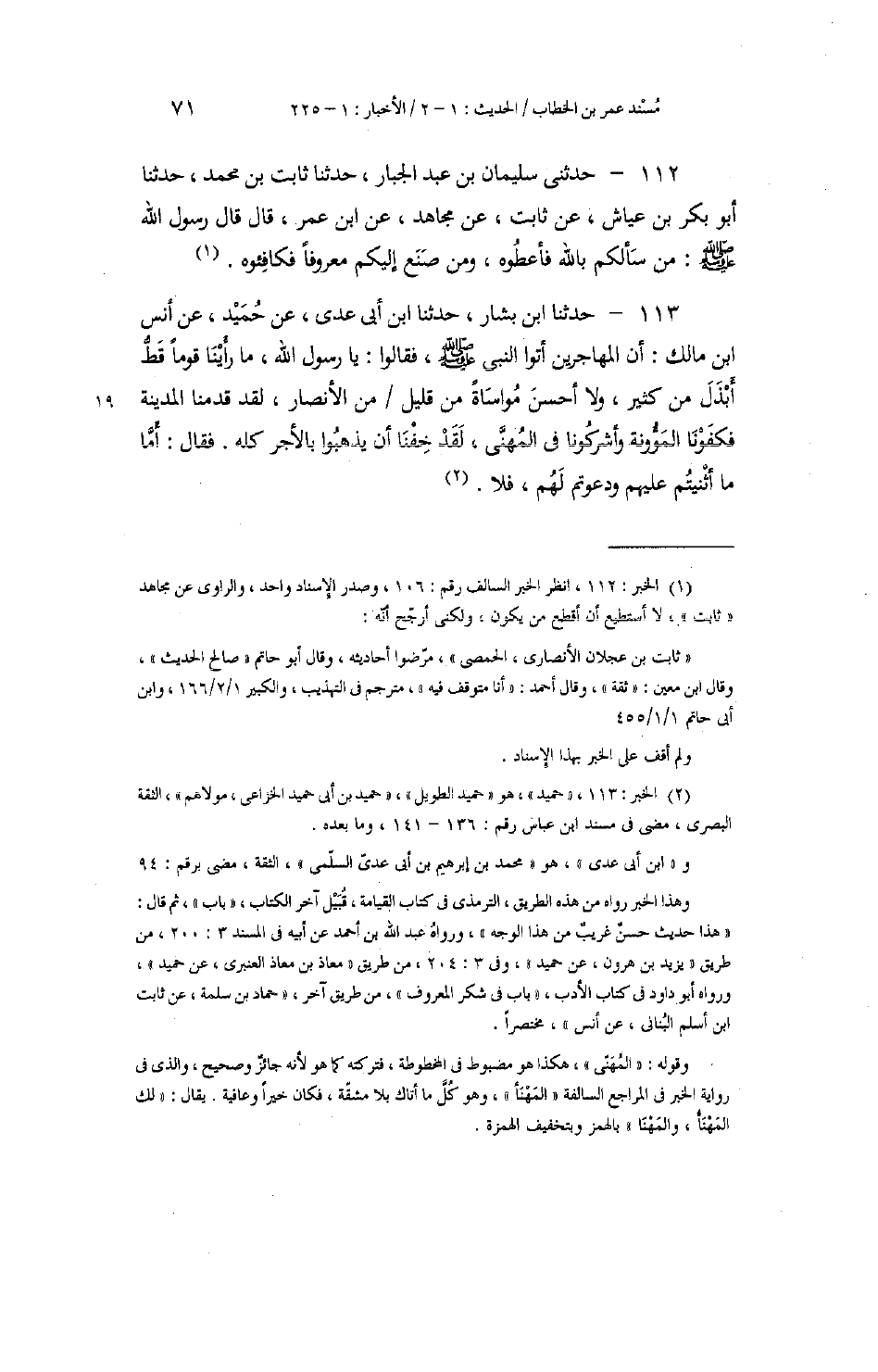 113 - حَدَّثَنَا ابْنُ بَشَّارٍ، حَدَّثَنَا ابْنُ أَبِي عَدِيٍّ، عَنْ حُمَيْدٍ، عَنْ أَنَسِ بْنِ مَالِكٍ أَنَّ الْمُهَاجِرِينَ أَتَوُا النَّبِيَّ صَلَّى اللهُ عَلَيْهِ وَسَلَّمَ، فَقَالُوا: يَا رَسُولَ اللَّهِ، مَا رَأَيْنَا قَوْمًا قَطُّ أَبْذَلَ مِنْ كَثِيرٍ، وَلَا أَحْسَنَ مُوَاسَاةً مِنْ قَلِيلٍ مِنَ الْأَنْصَارِ، لَقَدْ قَدِمْنَا الْمَدِينَةَ فَكَفَوْنَا الْمَئُونَةَ وَأَشْرَكُونَا فِي الْمُهَنَّى، لَقَدْ خِفْنَا أَنْ يَذْهَبُوا بِالْأَجْرِ كُلِّهِ، فَقَالَ: «§أَمَّا مَا أَثْنَيْتُمْ عَلَيْهِمْ وَدَعَوتُمْ لَهُمْ، فَلَا»