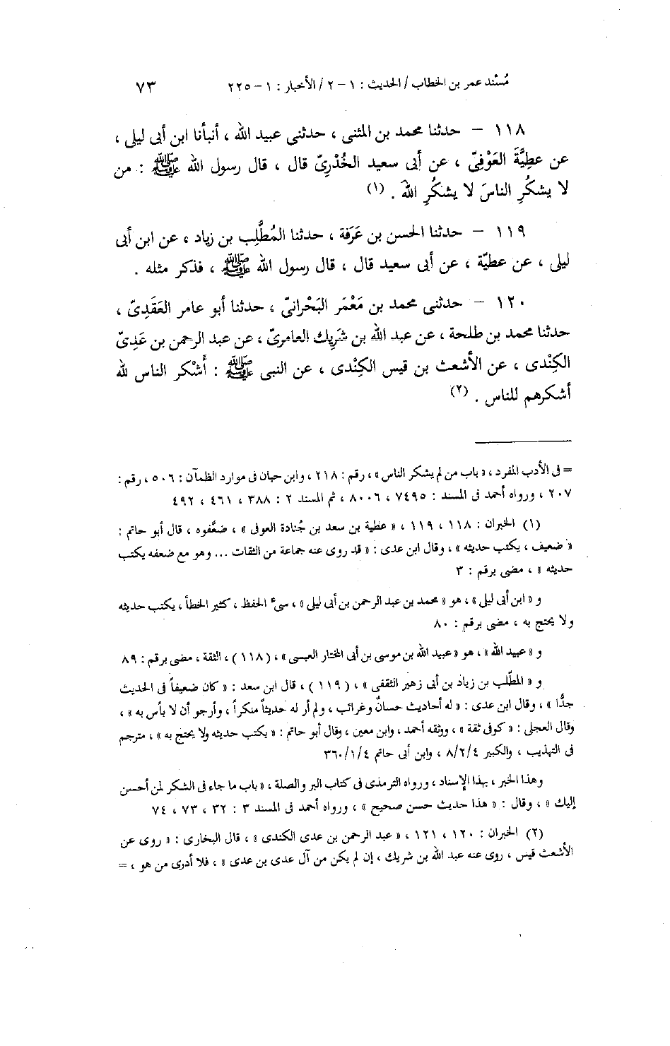 118 - حَدَّثَنَا مُحَمَّدُ بْنُ الْمُثَنَّى، حَدَّثَنِي عُبَيْدُ اللَّهِ، أَنْبَأَنَا ابْنُ أَبِي لَيْلَى، عَنْ عَطِيَّةَ الْعَوْفِيِّ، عَنْ أَبِي سَعِيدٍ الْخُدْرِيِّ، قَالَ: قَالَ رَسُولُ اللَّهِ صَلَّى اللهُ عَلَيْهِ وَسَلَّمَ: «§مَنْ لَا يَشْكُرِ النَّاسَ لَا يَشْكُرُ اللَّهَ» ،