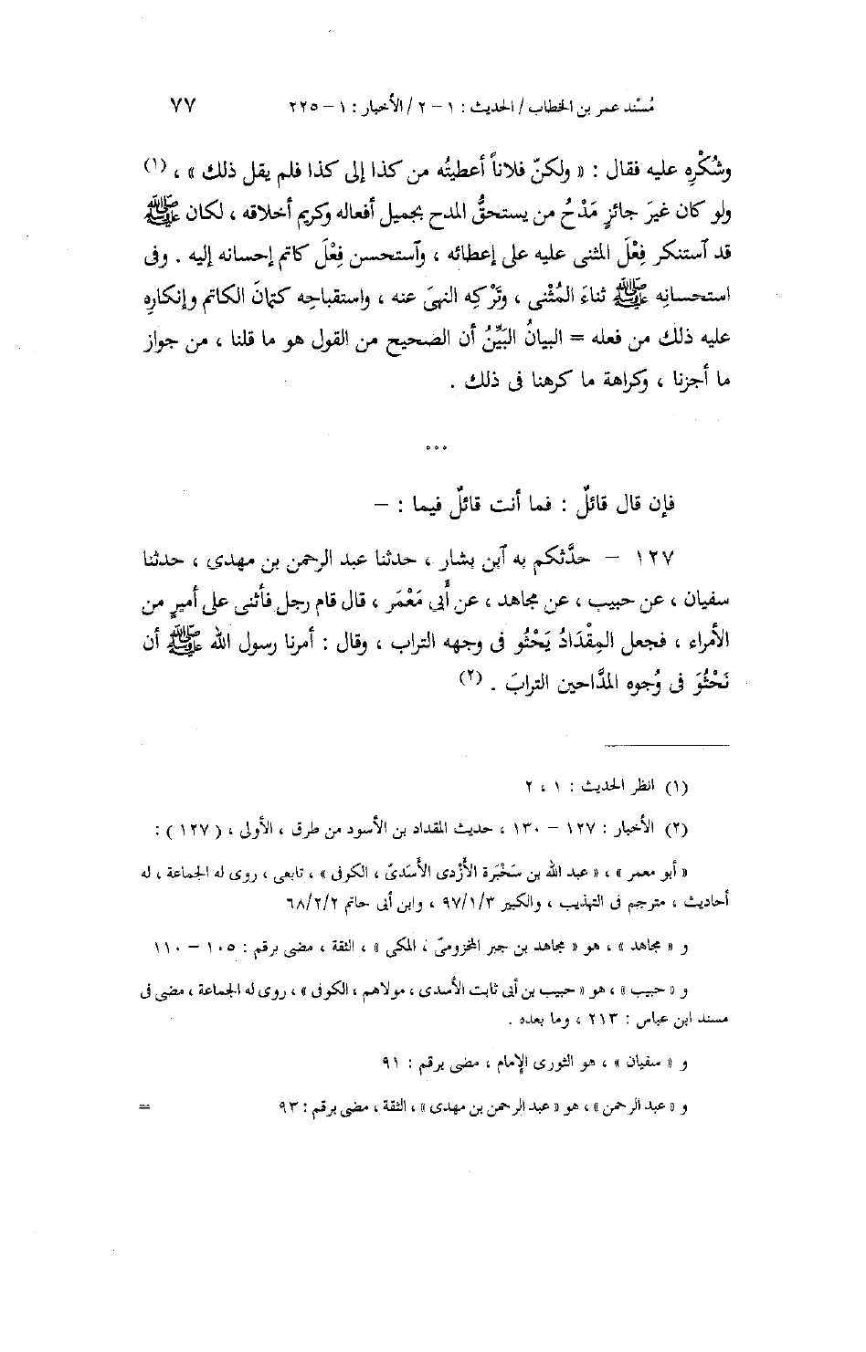 127 - حَدَّثَكُمْ بِهِ ابْنُ بَشَّارٍ حَدَّثَنَا عَبْدُ الرَّحْمَنِ بْنُ مَهْدِيٍّ، حَدَّثَنَا سُفْيَانُ، عَنْ حَبِيبٍ، عَنْ مُجَاهِدٍ، عَنْ أَبِي مَعْمَرٍ، قَالَ: قَامَ رَجُلٌ فَأَثْنَى عَلَى أَمِيرٍ مِنَ الْأُمَرَاءِ، فَجَعَلَ الْمِقْدَادُ يَحْثُو فِي وَجْهِهِ التُّرَابَ، وَقَالَ: " §أَمَرَنَا رَسُولُ اللَّهِ صَلَّى اللهُ عَلَيْهِ وَسَلَّمَ أَنْ نَحْثُوَ فِي وُجُوهِ الْمَدَّاحِينَ التُّرَابَ