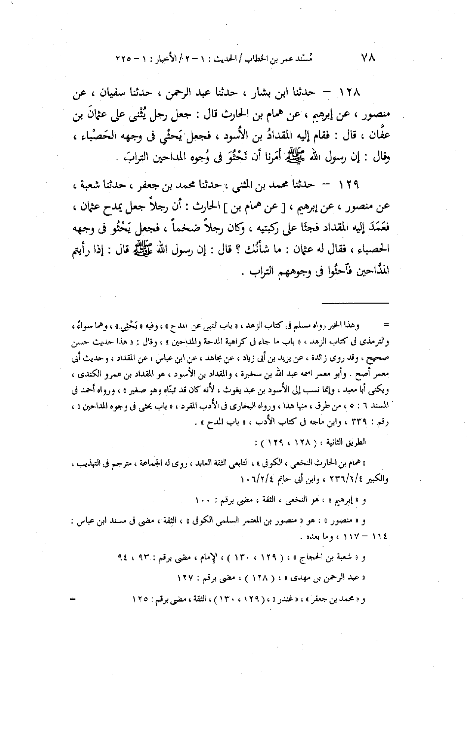 128 - حَدَّثَنَا ابْنُ بَشَّارٍ، حَدَّثَنَا عَبْدُ الرَّحْمَنِ، حَدَّثَنَا سُفْيَانُ، عَنْ مَنْصُورٍ، عَنْ إِبْرَاهِيمَ، عَنْ هَمَّامِ بْنِ الْحَارِثِ، قَالَ: جَعَلَ رَجُلٌ يُثْنِي عَلَى عُثْمَانَ بْنِ عَفَّانَ، قَالَ: فَقَامَ إِلَيْهِ الْمِقْدَادُ بْنُ الْأَسْوَدِ، فَجَعَلَ يَحْثِي فِي وَجْهِهِ الْحَصْبَاءَ، وَقَالَ: «إِنَّ رَسُولَ اللَّهِ صَلَّى اللهُ عَلَيْهِ وَسَلَّمَ §أَمَرَنَا أَنْ نَحْثُوَ فِي وُجُوهِ الْمَدَّاحِينَ التُّرَابَ»
