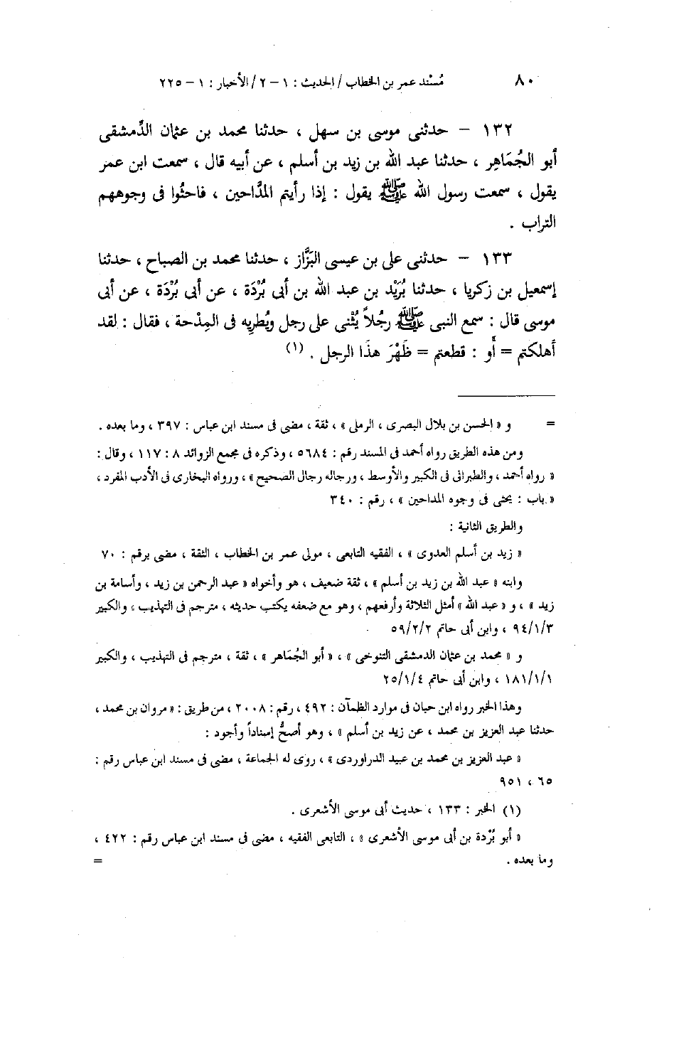 133 - حَدَّثَنِي عَلِيُّ بْنُ عِيسَى الْبَزَّازُ، حَدَّثَنَا مُحَمَّدُ بْنُ الصَّبَّاحِ، حَدَّثَنَا إِسْمَاعِيلُ بْنُ زَكَرِيَّا، حَدَّثَنَا بُرَيْدُ بْنُ عَبْدِ اللَّهِ بْنِ أَبِي بُرْدَةَ، عَنْ أَبِي بُرْدَةَ، عَنْ أَبِي مُوسَى، قَالَ: سَمِعَ النَّبِيُّ صَلَّى اللهُ عَلَيْهِ وَسَلَّمَ رَجُلًا يُثْنِي عَلَى رَجُلٍ وَيُطْرِيهِ فِي الْمِدْحَةِ، فَقَالَ: «§لَقَدْ أَهْلَكْتُمْ - أَوْ قَطَعْتُمْ - ظَهْرَ هَذَا الرَّجُلِ»