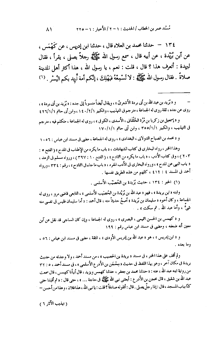 134 - حَدَّثَنَا مُحَمَّدُ بْنُ الْعَلَاءِ، قَالَ: حَدَّثَنَا ابْنُ إِدْرِيسَ، عَنْ كَهْمَسٍ، عَنِ ابْنِ بُرَيْدَةَ، عَنْ أَبِيهِ، قَالَ: سَمِعَ رَسُولُ اللَّهِ صَلَّى اللهُ عَلَيْهِ وَسَلَّمَ رَجُلًا يُصَلِّي، يَقْرَأُ، فَقَالَ لِبُرَيْدَةَ: «أَتَعْرِفُ هَذَا؟» قَالَ: قُلْتُ: نَعَمْ يَا رَسُولَ اللَّهِ، هَذَا أَكْثَرُ أَهْلِ الْمَدِينَةِ صَلَاةً. فَقَالَ رَسُولُ اللَّهِ صَلَّى اللهُ عَلَيْهِ وَسَلَّمَ: «§لَا تُسْمِعْهُ فَيَهْلِكَ، إِنَّكُمْ أُمَّةٌ أُرِيدَ بِكُمُ الْيُسْرَ»