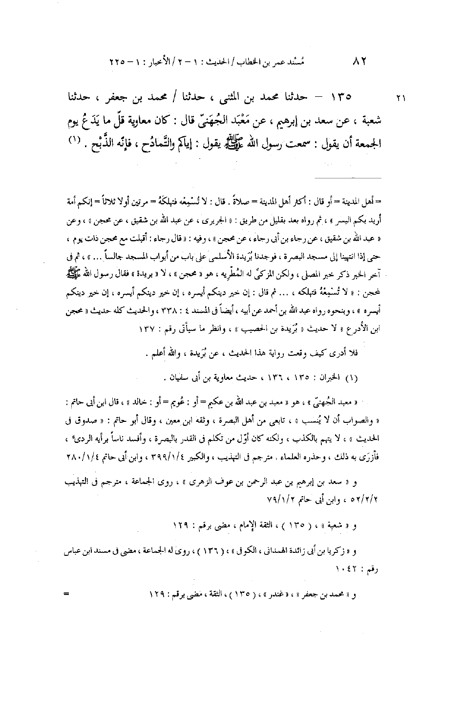 135 - حَدَّثَنَا مُحَمَّدُ بْنُ الْمُثَنَّى، حَدَّثَنَا مُحَمَّدُ بْنُ جَعْفَرٍ، حَدَّثَنَا شُعْبَةُ، عَنْ سَعْدِ بْنِ إِبْرَاهِيمَ، عَنْ مَعْبَدٍ الْجُهَنِيِّ، قَالَ: كَانَ مُعَاوِيَةُ قَلَّ مَا يَدَعُ يَوْمَ الْجُمُعَةِ أَنْ يَقُولَ: سَمِعْتُ رَسُولَ اللَّهِ صَلَّى اللهُ عَلَيْهِ وَسَلَّمَ يَقُولُ: «§إِيَّاكُمْ وَالتَّمَادُحَ فَإِنَّهُ الذَّبْحُ»