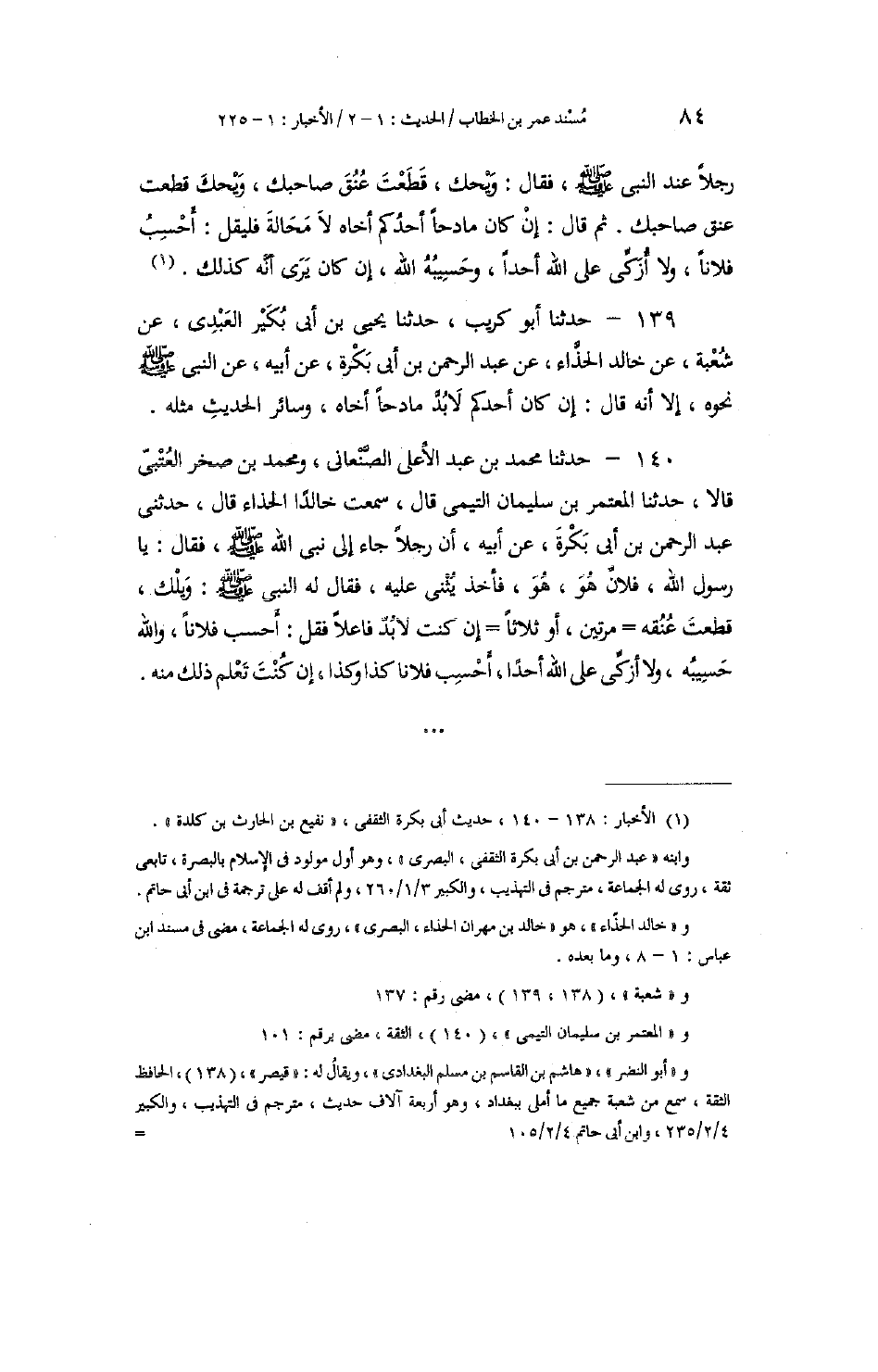 140 - حَدَّثَنَا مُحَمَّدُ بْنُ عَبْدِ الْأَعْلَى الصَّنْعَانِيُّ، وَمُحَمَّدُ بْنُ صَخْرٍ الْعُتْبِيُّ، قَالَا: حَدَّثَنَا الْمُعْتَمِرُ بْنُ سُلَيْمَانَ التَّيْمِيُّ، قَالَ: سَمِعْتُ خَالِدًا الْحَذَّاءَ، قَالَ: حَدَّثَنِي عَبْدُ الرَّحْمَنِ بْنُ أَبِي بَكْرَةَ، عَنْ أَبِيهِ: أَنَّ رَجُلًا جَاءَ إِلَى نَبِيِّ اللَّهِ صَلَّى اللهُ عَلَيْهِ وَسَلَّمَ، فَقَالَ: يَا رَسُولَ اللَّهِ، فُلَانٌ هُوَ هُوَ، فَأَخَذَ يُثْنِي عَلَيْهِ، فَقَالَ لَهُ النَّبِيُّ صَلَّى اللهُ عَلَيْهِ وَسَلَّمَ: " وَيْلَكَ §قَطَعْتَ عُنُقَهُ - مَرَّتَيْنِ، أَوْ ثَلَاثًا - إِنْ كُنْتَ لَا بُدَّ فَاعِلًا فَقُلْ: أَحْسِبُ فُلَانًا، وَاللَّهُ حَسِيبُهُ، وَلَا أُزَكِّي عَلَى اللَّهِ أَحَدًا، أَحْسِبُ فُلَانًا كَذَا وَكَذَا، إِنْ كُنْتَ تَعْلَمُ ذَلِكَ مِنْهُ " -[85]- قِيلَ: إِنَّ مَعَانِيَ هَذِهِ الْأَخْبَارِ هُوَ مَا قُلْنَا، وَلَمْ يَخْرُجْ شَيْءٌ مِنْهَا عَمَّا وَصَفْنَا، وَذَلِكَ أَنَّهُ غَيْرُ جَائِزٍ أَنْ يَقُولَ النَّبِيُّ صَلَّى اللهُ عَلَيْهِ وَسَلَّمَ أَقْوَالًا مُتَضَادَّةً، وَإِنَّمَا يَكُونُ فِي أَخْبَارِهِ الْخُصُوصُ وَالْعُمُومُ، وَالْمُجْمَلُ وَالْمُفَسَّرُ، وَالنَّاسِخُ وَالْمَنْسُوخُ، عَلَى مَا قَدْ بَيَّنَّا فِي سَائِرِ كُتُبِنَا. وَإِذْ كَانَ ذَلِكَ كَذَلِكَ، وَكَانَ صَحِيحًا عَنْهُ صَلَّى اللهُ عَلَيْهِ وَسَلَّمَ الْخَبَرُ بِالنَّهْيِ عَنِ الْمَدْحِ، وَثَابِتًا عَنْهُ النَّدْبُ إِلَيْهِ وَالْأَمْرُ بِهِ عُلِمَ أَنَّ مِمَّا أَمَرَ بِهِ مِنْ ذَلِكَ أَوْ نَدَبَ إِلَيْهِ، غَيْرُ الَّذِي نَهَى مِنْهُ، وَحَظرَهُ، أَوْ كَرِهَهُ وَأَنْكَرَهُ. وَإِذَا كَانَ ذَلِكَ كَذَلِكَ، صَحَّ الَّذِي قُلْنَا فِيمَا وَرَدَ عَنْهُ مِنَ الْأَخْبَارِ الَّتِي ذَكَرْنَاهَا، وَقَدْ