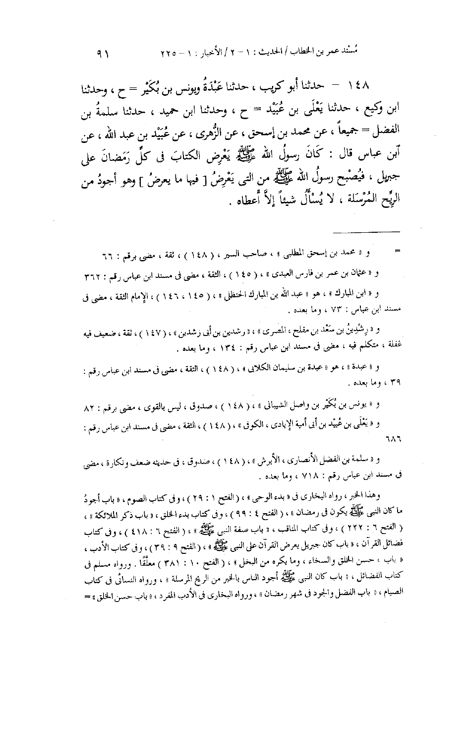 148 - حَدَّثَنَا أَبُو كُرَيْبٍ، حَدَّثَنَا عَبْدَةُ، وَيُونُسُ بْنُ بُكَيْرٍ، وَحَدَّثَنَا ابْنُ وَكِيعٍ، حَدَّثَنَا يَعْلَى بْنُ عُبَيْدٍ، وَحَدَّثَنَا ابْنُ حُمَيْدٍ، حَدَّثَنَا سَلَمَةُ بْنُ الْفَضْلِ، جَمِيعًا عَنْ مُحَمَّدِ بْنِ إِسْحَاقَ، عَنِ الزُّهْرِيِّ، عَنْ عُبَيْدِ بْنِ عَبْدِ اللَّهِ، عَنِ ابْنِ عَبَّاسٍ، قَالَ: «كَانَ رَسُولُ اللَّهِ صَلَّى اللهُ عَلَيْهِ وَسَلَّمَ §يَعْرِضُ الْكِتَابَ فِي كُلِّ رَمَضَانَ عَلَى جِبْرِيلَ، فَيُصْبِحُ رَسُولُ اللَّهِ صَلَّى اللهُ عَلَيْهِ وَسَلَّمَ مِنَ الَّتِي يَعْرِضُ فِيهَا مَا يَعْرِضُ وَهُوَ أَجْوَدُ مِنَ الرِّيحِ الْمُرْسَلَةِ، لَا يُسْأَلُ شَيْئًا إِلَّا أَعْطَاهُ»